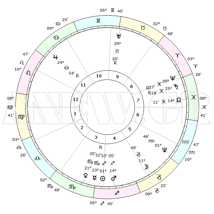 | | ΘΕΣΕΙΣ ΠΛΑΝΗΤΩΝ ΑΣΤΡΟΛΟΓΙΚΟΥ ΧΑΡΤΗ ΤΗΣ ΣΤΙΓΜΗΣ ΑΥΤΗΣ | | | | Πλανήτης | Ζώδιο | Μοίρες | Δεκαήμ. | Σε οίκο | Απόκλιση | | Ακμές των οίκων | | Ηλιος | Τοξότης | 01°50' | Πρώτο | 4 | 20 S 31 | | 1ος | 23°19' | Λέων | | Σελήνη | Αιγόκερως | 11°11' | Δεύτερο | 5 | 27 S 26 | | 2ος | 16°28' | Παρθένος | | Ερμής | Σκορπιός | 23°55'R | Τρίτο | 4 | 17 S 11 | | 3ος | 14°29' | Ζυγός | | Αφροδίτη | Σκορπιός | 21°16' | Τρίτο | 4 | 17 S 09 | | 4ος | 17°16' | Σκορπιός | | Αρης | Τοξότης | 14°03' | Δεύτερο | 4 | 23 S 05 | | 5ος | 21°56' | Τοξότης | | Δίας | Καρκίνος | 24°54'R | Τρίτο | 12 | 21 N 17 | | 6ος | 24°29' | Αιγόκερως | | Κρόνος | Ιχθείς | 25°18'R | Τρίτο | 8 | 04 S 04 | | 7ος | 23°19' | Υδροχόος | | Ουρανός | Ταύρος | 29°20'R | Τρίτο | 10 | 19 N 48 | | 8ος | 16°28' | Ιχθείς | | Ποσειδώνας | Ιχθείς | 29°27'R | Τρίτο | 8 | 01 S 28 | | 9ος | 14°29' | Κριός | | Πλούτωνας | Υδροχόος | 01°46' | Πρώτο | 6 | 23 S 26 | | 10ος | 17°16' | Ταύρος | | Β. Δεσμός | Ιχθείς | 14°11' | Δεύτερο | 7 | 06 S 13 | | 11ος | 21°56' | Δίδυμοι | | Ωροσκόπος | Λέων | 23°19' | Τρίτο | | | 12ος | 24°29' | Καρκίνος | | Μεσουράνημα | Ταύρος | 17°16' | Δεύτερο | | | |