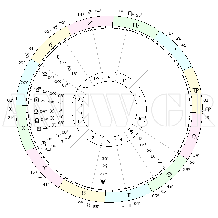 | | ΘΕΣΕΙΣ ΠΛΑΝΗΤΩΝ ΑΣΤΡΟΛΟΓΙΚΟΥ ΧΑΡΤΗ ΤΗΣ ΣΤΙΓΜΗΣ ΑΥΤΗΣ | | | | Πλανήτης | Ζώδιο | Μοίρες | Δεκαήμ. | Σε οίκο | Απόκλιση | | Ακμές των οίκων | | Ηλιος | Υδροχόος | 25°27' | Τρίτο | 1 | 13 S 02 | | 1ος | 23°29' | Αιγόκερως | | Σελήνη | Αιγόκερως | 16°12' | Δεύτερο | 12 | 26 S 37 | | 2ος | 06°23' | Ιχθείς | | Ερμής | Ιχθείς | 12°01' | Δεύτερο | 2 | 07 S 11 | | 3ος | 15°44' | Κριός | | Αφροδίτη | Ιχθείς | 04°40' | Πρώτο | 1 | 11 S 10 | | 4ος | 15°21' | Ταύρος | | Αρης | Υδροχόος | 17°04' | Δεύτερο | 1 | 16 S 45 | | 5ος | 08°39' | Δίδυμοι | | Δίας | Καρκίνος | 16°05'R | Δεύτερο | 6 | 22 N 47 | | 6ος | 29°54' | Δίδυμοι | | Κρόνος | Κριός | 00°08' | Πρώτο | 2 | 01 S 55 | | 7ος | 23°29' | Καρκίνος | | Ουρανός | Ταύρος | 27°30' | Τρίτο | 4 | 19 N 25 | | 8ος | 06°23' | Παρθένος | | Ποσειδώνας | Κριός | 00°32' | Πρώτο | 2 | 00 S 59 | | 9ος | 15°44' | Ζυγός | | Πλούτωνας | Υδροχόος | 04°07' | Πρώτο | 1 | 22 S 57 | | 10ος | 15°21' | Σκορπιός | | Β. Δεσμός | Ιχθείς | 09°50' | Πρώτο | 2 | 07 S 53 | | 11ος | 08°39' | Τοξότης | | Ωροσκόπος | Αιγόκερως | 23°29' | Τρίτο | | | 12ος | 29°54' | Τοξότης | | Μεσουράνημα | Σκορπιός | 15°21' | Δεύτερο | | | |