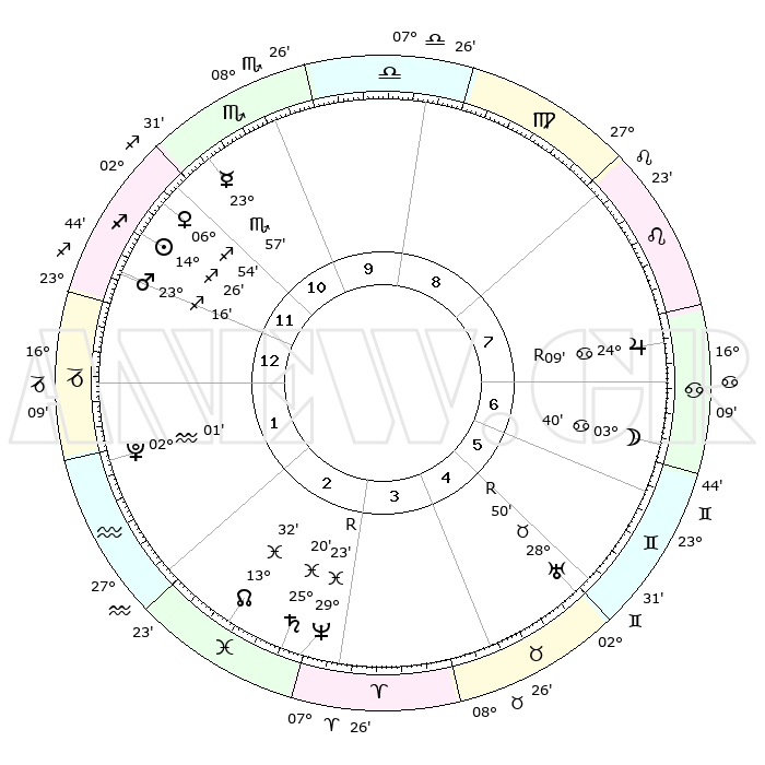 | | ΘΕΣΕΙΣ ΠΛΑΝΗΤΩΝ ΑΣΤΡΟΛΟΓΙΚΟΥ ΧΑΡΤΗ ΤΗΣ ΣΤΙΓΜΗΣ ΑΥΤΗΣ | | | | Πλανήτης | Ζώδιο | Μοίρες | Δεκαήμ. | Σε οίκο | Απόκλιση | | Ακμές των οίκων | | Ηλιος | Τοξότης | 14°23' | Δεύτερο | 12 | 22 S 31 | | 1ος | 25°57' | Τοξότης | | Σελήνη | Καρκίνος | 02°48' | Πρώτο | 7 | 28 N 07 | | 2ος | 02°05' | Υδροχόος | | Ερμής | Σκορπιός | 23°54' | Τρίτο | 11 | 16 S 22 | | 3ος | 11°45' | Ιχθείς | | Αφροδίτη | Τοξότης | 06°50' | Πρώτο | 12 | 20 S 57 | | 4ος | 16°17' | Κριός | | Αρης | Τοξότης | 23°13' | Τρίτο | 12 | 23 S 58 | | 5ος | 13°16' | Ταύρος | | Δίας | Καρκίνος | 24°09'R | Τρίτο | 7 | 21 N 27 | | 6ος | 05°21' | Δίδυμοι | | Κρόνος | Ιχθείς | 25°20' | Τρίτο | 3 | 04 S 01 | | 7ος | 25°57' | Δίδυμοι | | Ουρανός | Ταύρος | 28°50'R | Τρίτο | 5 | 19 N 42 | | 8ος | 02°05' | Λέων | | Ποσειδώνας | Ιχθείς | 29°23'R | Τρίτο | 3 | 01 S 29 | | 9ος | 11°45' | Παρθένος | | Πλούτωνας | Υδροχόος | 02°01' | Πρώτο | 1 | 23 S 22 | | 10ος | 16°17' | Ζυγός | | Β. Δεσμός | Ιχθείς | 13°32' | Δεύτερο | 3 | 06 S 28 | | 11ος | 13°16' | Σκορπιός | | Ωροσκόπος | Τοξότης | 25°57' | Τρίτο | | | 12ος | 05°21' | Τοξότης | | Μεσουράνημα | Ζυγός | 16°17' | Δεύτερο | | | |