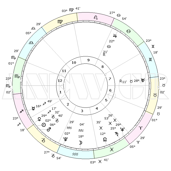 | | ΘΕΣΕΙΣ ΠΛΑΝΗΤΩΝ ΑΣΤΡΟΛΟΓΙΚΟΥ ΧΑΡΤΗ ΤΗΣ ΣΤΙΓΜΗΣ ΑΥΤΗΣ | | | | Πλανήτης | Ζώδιο | Μοίρες | Δεκαήμ. | Σε οίκο | Απόκλιση | | Ακμές των οίκων | | Ηλιος | Αιγόκερως | 02°27' | Πρώτο | 2 | 23 S 25 | | 1ος | 02°55' | Σκορπιός | | Σελήνη | Υδροχόος | 17°12' | Δεύτερο | 4 | 17 S 39 | | 2ος | 01°31' | Τοξότης | | Ερμής | Τοξότης | 16°43' | Δεύτερο | 2 | 22 S 24 | | 3ος | 03°43' | Αιγόκερως | | Αφροδίτη | Τοξότης | 29°12' | Τρίτο | 2 | 23 S 38 | | 4ος | 08°06' | Υδροχόος | | Αρης | Αιγόκερως | 06°37' | Πρώτο | 3 | 24 S 06 | | 5ος | 10°59' | Ιχθείς | | Δίας | Καρκίνος | 22°21'R | Τρίτο | 9 | 21 N 48 | | 6ος | 09°23' | Κριός | | Κρόνος | Ιχθείς | 25°52' | Τρίτο | 5 | 03 S 44 | | 7ος | 02°55' | Ταύρος | | Ουρανός | Ταύρος | 28°11'R | Τρίτο | 7 | 19 N 33 | | 8ος | 01°31' | Δίδυμοι | | Ποσειδώνας | Ιχθείς | 29°26' | Τρίτο | 5 | 01 S 27 | | 9ος | 03°43' | Καρκίνος | | Πλούτωνας | Υδροχόος | 02°29' | Πρώτο | 3 | 23 S 16 | | 10ος | 08°06' | Λέων | | Β. Δεσμός | Ιχθείς | 12°35' | Δεύτερο | 5 | 06 S 50 | | 11ος | 10°59' | Παρθένος | | Ωροσκόπος | Σκορπιός | 02°55' | Πρώτο | | | 12ος | 09°23' | Ζυγός | | Μεσουράνημα | Λέων | 08°06' | Πρώτο | | | |