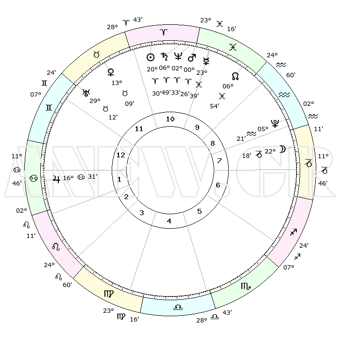 | | ΘΕΣΕΙΣ ΠΛΑΝΗΤΩΝ ΑΣΤΡΟΛΟΓΙΚΟΥ ΧΑΡΤΗ ΤΗΣ ΣΤΙΓΜΗΣ ΑΥΤΗΣ | | | | Πλανήτης | Ζώδιο | Μοίρες | Δεκαήμ. | Σε οίκο | Απόκλιση | | Ακμές των οίκων | | Ηλιος | Κριός | 20°25' | Τρίτο | 11 | 07 N 59 | | 1ος | 13°22' | Δίδυμοι | | Σελήνη | Αιγόκερως | 21°17' | Τρίτο | 8 | 25 S 28 | | 2ος | 05°52' | Καρκίνος | | Ερμής | Ιχθείς | 23°33' | Τρίτο | 11 | 04 S 44 | | 3ος | 27°05' | Καρκίνος | | Αφροδίτη | Ταύρος | 13°03' | Δεύτερο | 12 | 15 N 43 | | 4ος | 21°06' | Λέων | | Αρης | Κριός | 00°22' | Πρώτο | 11 | 00 S 47 | | 5ος | 22°01' | Παρθένος | | Δίας | Καρκίνος | 16°30' | Δεύτερο | 2 | 22 N 47 | | 6ος | 02°01' | Σκορπιός | | Κρόνος | Κριός | 06°49' | Πρώτο | 11 | 00 N 44 | | 7ος | 13°22' | Τοξότης | | Ουρανός | Ταύρος | 29°11' | Τρίτο | 12 | 19 N 48 | | 8ος | 05°52' | Αιγόκερως | | Ποσειδώνας | Κριός | 02°33' | Πρώτο | 11 | 00 S 11 | | 9ος | 27°05' | Αιγόκερως | | Πλούτωνας | Υδροχόος | 05°21' | Πρώτο | 9 | 22 S 47 | | 10ος | 21°06' | Υδροχόος | | Β. Δεσμός | Ιχθείς | 06°55' | Πρώτο | 10 | 08 S 58 | | 11ος | 22°01' | Ιχθείς | | Ωροσκόπος | Δίδυμοι | 13°22' | Δεύτερο | | | 12ος | 02°01' | Ταύρος | | Μεσουράνημα | Υδροχόος | 21°06' | Τρίτο | | | |