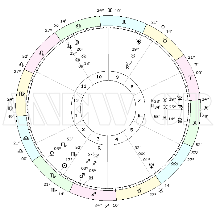 | | ΘΕΣΕΙΣ ΠΛΑΝΗΤΩΝ ΑΣΤΡΟΛΟΓΙΚΟΥ ΧΑΡΤΗ ΤΗΣ ΣΤΙΓΜΗΣ ΑΥΤΗΣ | | | | Πλανήτης | Ζώδιο | Μοίρες | Δεκαήμ. | Σε οίκο | Απόκλιση | | Ακμές των οίκων | | Ηλιος | Σκορπιός | 17°47' | Δεύτερο | 3 | 17 S 08 | | 1ος | 29°22' | Λέων | | Σελήνη | Καρκίνος | 18°59' | Δεύτερο | 11 | 26 N 19 | | 2ος | 23°09' | Παρθένος | | Ερμής | Τοξότης | 06°52'R | Πρώτο | 4 | 23 S 45 | | 3ος | 21°46' | Ζυγός | | Αφροδίτη | Σκορπιός | 03°46' | Πρώτο | 3 | 11 S 31 | | 4ος | 24°40' | Σκορπιός | | Αρης | Τοξότης | 03°54' | Πρώτο | 4 | 21 S 23 | | 5ος | 28°54' | Τοξότης | | Δίας | Καρκίνος | 25°09' | Τρίτο | 11 | 21 N 12 | | 6ος | 00°55' | Υδροχόος | | Κρόνος | Ιχθείς | 25°35'R | Τρίτο | 8 | 04 S 00 | | 7ος | 29°22' | Υδροχόος | | Ουρανός | Ταύρος | 29°55'R | Τρίτο | 10 | 19 N 55 | | 8ος | 23°09' | Ιχθείς | | Ποσειδώνας | Ιχθείς | 29°38'R | Τρίτο | 8 | 01 S 24 | | 9ος | 21°46' | Κριός | | Πλούτωνας | Υδροχόος | 01°32' | Πρώτο | 6 | 23 S 29 | | 10ος | 24°40' | Ταύρος | | Β. Δεσμός | Ιχθείς | 14°56' | Δεύτερο | 7 | 05 S 56 | | 11ος | 28°54' | Δίδυμοι | | Ωροσκόπος | Λέων | 29°22' | Τρίτο | | | 12ος | 00°55' | Λέων | | Μεσουράνημα | Ταύρος | 24°40' | Τρίτο | | | |