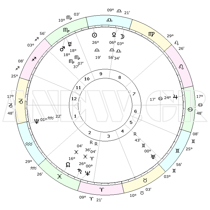| ΘΕΣΕΙΣ ΠΛΑΝΗΤΩΝ ΑΣΤΡΟΛΟΓΙΚΟΥ ΧΑΡΤΗ ΤΗΣ ΣΤΙΓΜΗΣ ΑΥΤΗΣ | | Πλανήτης | Ζώδιο | Μοίρες | Δεκαήμ. | Σε οίκο | Απόκλιση | | Ακμές των οίκων | Ηλιος | Ζυγός | 26°14' | Τρίτο | 10 | 10 S 07 | | 1ος | 18°33' | Τοξότης | Σελήνη | Ζυγός | 02°31' | Πρώτο | 9 | 02 S 12 | | 2ος | 22°59' | Αιγόκερως | Ερμής | Σκορπιός | 18°00' | Δεύτερο | 11 | 19 S 16 | | 3ος | 01°43' | Ιχθείς | Αφροδίτη | Ζυγός | 06°50' | Πρώτο | 9 | 01 S 18 | | 4ος | 07°08' | Κριός | Αρης | Σκορπιός | 18°33' | Δεύτερο | 11 | 17 S 36 | | 5ος | 05°21' | Ταύρος | Δίας | Καρκίνος | 24°17' | Τρίτο | 8 | 21 N 19 | | 6ος | 28°07' | Ταύρος | Κρόνος | Ιχθείς | 26°36'R | Τρίτο | 3 | 03 S 38 | | 7ος | 18°33' | Δίδυμοι | Ουρανός | Δίδυμοι | 00°43'R | Πρώτο | 6 | 20 N 05 | | 8ος | 22°59' | Καρκίνος | Ποσειδώνας | Κριός | 00°04'R | Πρώτο | 3 | 01 S 14 | | 9ος | 01°43' | Παρθένος | Πλούτωνας | Υδροχόος | 01°22' | Πρώτο | 2 | 23 S 32 | | 10ος | 07°08' | Ζυγός | Β. Δεσμός | Ιχθείς | 16°04' | Δεύτερο | 3 | 05 S 30 | | 11ος | 05°21' | Σκορπιός | Ωροσκόπος | Τοξότης | 18°33' | Δεύτερο | | | 12ος | 28°07' | Σκορπιός | Μεσουράνημα | Ζυγός | 07°08' | Πρώτο | | | |