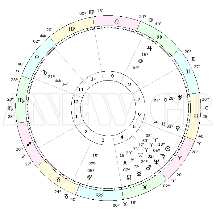 | | ΘΕΣΕΙΣ ΠΛΑΝΗΤΩΝ ΑΣΤΡΟΛΟΓΙΚΟΥ ΧΑΡΤΗ ΤΗΣ ΣΤΙΓΜΗΣ ΑΥΤΗΣ | | | | Πλανήτης | Ζώδιο | Μοίρες | Δεκαήμ. | Σε οίκο | Απόκλιση | | Ακμές των οίκων | | Ηλιος | Κριός | 13°01' | Δεύτερο | 6 | 05 N 08 | | 1ος | 00°20' | Σκορπιός | | Σελήνη | Ζυγός | 20°42' | Τρίτο | 12 | 11 S 18 | | 2ος | 28°46' | Σκορπιός | | Ερμής | Ιχθείς | 15°16' | Δεύτερο | 5 | 07 S 15 | | 3ος | 00°45' | Αιγόκερως | | Αφροδίτη | Ταύρος | 03°49' | Πρώτο | 7 | 12 N 26 | | 4ος | 04°58' | Υδροχόος | | Αρης | Ιχθείς | 24°30' | Τρίτο | 5 | 03 S 08 | | 5ος | 07°53' | Ιχθείς | | Δίας | Καρκίνος | 15°54' | Δεύτερο | 9 | 22 N 51 | | 6ος | 06°31' | Κριός | | Κρόνος | Κριός | 05°53' | Πρώτο | 5 | 00 N 23 | | 7ος | 00°20' | Ταύρος | | Ουρανός | Ταύρος | 28°50' | Τρίτο | 8 | 19 N 44 | | 8ος | 28°46' | Ταύρος | | Ποσειδώνας | Κριός | 02°17' | Πρώτο | 5 | 00 S 18 | | 9ος | 00°45' | Καρκίνος | | Πλούτωνας | Υδροχόος | 05°15' | Πρώτο | 4 | 22 S 47 | | 10ος | 04°58' | Λέων | | Β. Δεσμός | Ιχθείς | 07°19' | Πρώτο | 4 | 08 S 49 | | 11ος | 07°53' | Παρθένος | | Ωροσκόπος | Σκορπιός | 00°20' | Πρώτο | | | 12ος | 06°31' | Ζυγός | | Μεσουράνημα | Λέων | 04°58' | Πρώτο | | | |