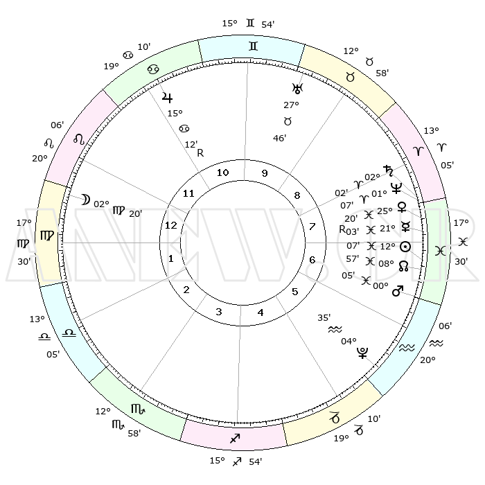 | | ΘΕΣΕΙΣ ΠΛΑΝΗΤΩΝ ΑΣΤΡΟΛΟΓΙΚΟΥ ΧΑΡΤΗ ΤΗΣ ΣΤΙΓΜΗΣ ΑΥΤΗΣ | | | | Πλανήτης | Ζώδιο | Μοίρες | Δεκαήμ. | Σε οίκο | Απόκλιση | | Ακμές των οίκων | | Ηλιος | Ιχθείς | 12°03' | Δεύτερο | 7 | 07 S 02 | | 1ος | 00°38' | Παρθένος | | Σελήνη | Παρθένος | 01°33' | Πρώτο | 1 | 11 N 33 | | 2ος | 24°33' | Παρθένος | | Ερμής | Ιχθείς | 21°05'R | Τρίτο | 7 | 00 S 18 | | 3ος | 23°17' | Ζυγός | | Αφροδίτη | Ιχθείς | 25°16' | Τρίτο | 8 | 03 S 06 | | 4ος | 26°12' | Σκορπιός | | Αρης | Ιχθείς | 00°03' | Πρώτο | 6 | 12 S 29 | | 5ος | 00°21' | Αιγόκερως | | Δίας | Καρκίνος | 15°12'R | Δεύτερο | 11 | 22 N 55 | | 6ος | 02°16' | Υδροχόος | | Κρόνος | Κριός | 02°02' | Πρώτο | 8 | 01 S 09 | | 7ος | 00°38' | Ιχθείς | | Ουρανός | Ταύρος | 27°46' | Τρίτο | 10 | 19 N 29 | | 8ος | 24°33' | Ιχθείς | | Ποσειδώνας | Κριός | 01°06' | Πρώτο | 8 | 00 S 45 | | 9ος | 23°17' | Κριός | | Πλούτωνας | Υδροχόος | 04°35' | Πρώτο | 6 | 22 S 52 | | 10ος | 26°12' | Ταύρος | | Β. Δεσμός | Ιχθείς | 08°57' | Πρώτο | 7 | 08 S 13 | | 11ος | 00°21' | Καρκίνος | | Ωροσκόπος | Παρθένος | 00°38' | Πρώτο | | | 12ος | 02°16' | Λέων | | Μεσουράνημα | Ταύρος | 26°12' | Τρίτο | | | |