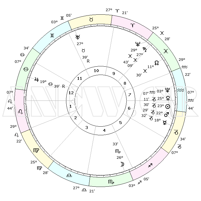 | | ΘΕΣΕΙΣ ΠΛΑΝΗΤΩΝ ΑΣΤΡΟΛΟΓΙΚΟΥ ΧΑΡΤΗ ΤΗΣ ΣΤΙΓΜΗΣ ΑΥΤΗΣ | | | | Πλανήτης | Ζώδιο | Μοίρες | Δεκαήμ. | Σε οίκο | Απόκλιση | | Ακμές των οίκων | | Ηλιος | Αιγόκερως | 23°26' | Τρίτο | 7 | 21 S 24 | | 1ος | 16°26' | Καρκίνος | | Σελήνη | Σκορπιός | 25°41' | Τρίτο | 5 | 23 S 59 | | 2ος | 06°53' | Λέων | | Ερμής | Αιγόκερως | 18°25' | Δεύτερο | 7 | 23 S 51 | | 3ος | 00°12' | Παρθένος | | Αφροδίτη | Αιγόκερως | 25°05' | Τρίτο | 7 | 22 S 02 | | 4ος | 29°15' | Παρθένος | | Αρης | Αιγόκερως | 22°25' | Τρίτο | 7 | 22 S 31 | | 5ος | 05°04' | Σκορπιός | | Δίας | Καρκίνος | 19°40'R | Δεύτερο | 1 | 22 N 15 | | 6ος | 13°02' | Τοξότης | | Κρόνος | Ιχθείς | 27°08' | Τρίτο | 9 | 03 S 11 | | 7ος | 16°26' | Αιγόκερως | | Ουρανός | Ταύρος | 27°39'R | Τρίτο | 11 | 19 N 27 | | 8ος | 06°53' | Υδροχόος | | Ποσειδώνας | Ιχθείς | 29°43' | Τρίτο | 10 | 01 S 20 | | 9ος | 00°12' | Ιχθείς | | Πλούτωνας | Υδροχόος | 03°07' | Πρώτο | 7 | 23 S 08 | | 10ος | 29°15' | Ιχθείς | | Β. Δεσμός | Ιχθείς | 11°30' | Δεύτερο | 9 | 07 S 15 | | 11ος | 05°04' | Ταύρος | | Ωροσκόπος | Καρκίνος | 16°26' | Δεύτερο | | | 12ος | 13°02' | Δίδυμοι | | Μεσουράνημα | Ιχθείς | 29°15' | Τρίτο | | | |