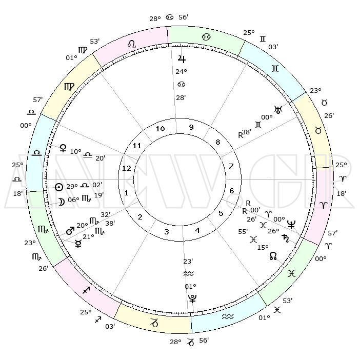 | ΘΕΣΕΙΣ ΠΛΑΝΗΤΩΝ ΑΣΤΡΟΛΟΓΙΚΟΥ ΧΑΡΤΗ ΤΗΣ ΣΤΙΓΜΗΣ ΑΥΤΗΣ | | Πλανήτης | Ζώδιο | Μοίρες | Δεκαήμ. | Σε οίκο | Απόκλιση | | Ακμές των οίκων | Ηλιος | Ζυγός | 28°41' | Τρίτο | 4 | 11 S 00 | | 1ος | 13°12' | Καρκίνος | Σελήνη | Σκορπιός | 02°11' | Πρώτο | 5 | 15 S 37 | | 2ος | 03°37' | Λέων | Ερμής | Σκορπιός | 21°11' | Τρίτο | 5 | 20 S 21 | | 3ος | 26°34' | Λέων | Αφροδίτη | Ζυγός | 09°54' | Πρώτο | 4 | 02 S 30 | | 4ος | 25°05' | Παρθένος | Αρης | Σκορπιός | 20°17' | Τρίτο | 5 | 18 S 06 | | 5ος | 00°39' | Σκορπιός | Δίας | Καρκίνος | 24°27' | Τρίτο | 1 | 21 N 17 | | 6ος | 09°08' | Τοξότης | Κρόνος | Ιχθείς | 26°27'R | Τρίτο | 10 | 03 S 42 | | 7ος | 13°12' | Αιγόκερως | Ουρανός | Δίδυμοι | 00°38'R | Πρώτο | 11 | 20 N 04 | | 8ος | 03°37' | Υδροχόος | Ποσειδώνας | Κριός | 00°01'R | Πρώτο | 10 | 01 S 15 | | 9ος | 26°34' | Υδροχόος | Πλούτωνας | Υδροχόος | 01°23' | Πρώτο | 7 | 23 S 32 | | 10ος | 25°05' | Ιχθείς | Β. Δεσμός | Ιχθείς | 15°56' | Δεύτερο | 9 | 05 S 33 | | 11ος | 00°39' | Ταύρος | Ωροσκόπος | Καρκίνος | 13°12' | Δεύτερο | | | 12ος | 09°08' | Δίδυμοι | Μεσουράνημα | Ιχθείς | 25°05' | Τρίτο | | | |