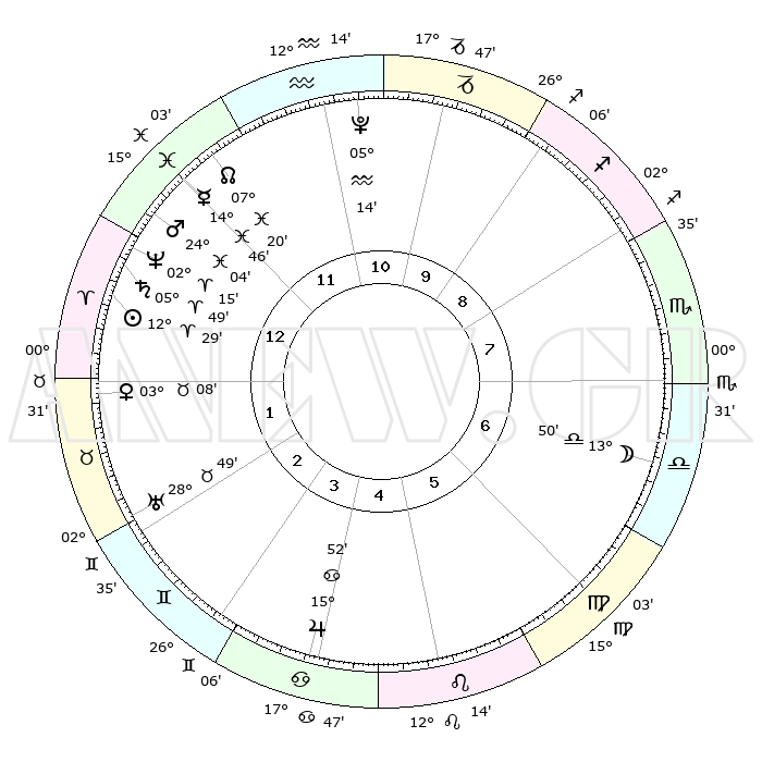 | | ΘΕΣΕΙΣ ΠΛΑΝΗΤΩΝ ΑΣΤΡΟΛΟΓΙΚΟΥ ΧΑΡΤΗ ΤΗΣ ΣΤΙΓΜΗΣ ΑΥΤΗΣ | | | | Πλανήτης | Ζώδιο | Μοίρες | Δεκαήμ. | Σε οίκο | Απόκλιση | | Ακμές των οίκων | | Ηλιος | Κριός | 12°26' | Δεύτερο | 1 | 04 N 55 | | 1ος | 01°35' | Κριός | | Σελήνη | Ζυγός | 13°11' | Δεύτερο | 7 | 07 S 55 | | 2ος | 11°30' | Ταύρος | | Ερμής | Ιχθείς | 14°43' | Δεύτερο | 12 | 07 S 23 | | 3ος | 08°39' | Δίδυμοι | | Αφροδίτη | Ταύρος | 03°05' | Πρώτο | 1 | 12 N 10 | | 4ος | 00°53' | Καρκίνος | | Αρης | Ιχθείς | 24°02' | Τρίτο | 12 | 03 S 20 | | 5ος | 23°16' | Καρκίνος | | Δίας | Καρκίνος | 15°51' | Δεύτερο | 4 | 22 N 52 | | 6ος | 20°55' | Λέων | | Κρόνος | Κριός | 05°48' | Πρώτο | 1 | 00 N 21 | | 7ος | 01°35' | Ζυγός | | Ουρανός | Ταύρος | 28°49' | Τρίτο | 2 | 19 N 43 | | 8ος | 11°30' | Σκορπιός | | Ποσειδώνας | Κριός | 02°15' | Πρώτο | 1 | 00 S 18 | | 9ος | 08°39' | Τοξότης | | Πλούτωνας | Υδροχόος | 05°14' | Πρώτο | 11 | 22 S 47 | | 10ος | 00°53' | Αιγόκερως | | Β. Δεσμός | Ιχθείς | 07°21' | Πρώτο | 12 | 08 S 49 | | 11ος | 23°16' | Αιγόκερως | | Ωροσκόπος | Κριός | 01°35' | Πρώτο | | | 12ος | 20°55' | Υδροχόος | | Μεσουράνημα | Αιγόκερως | 00°53' | Πρώτο | | | |
