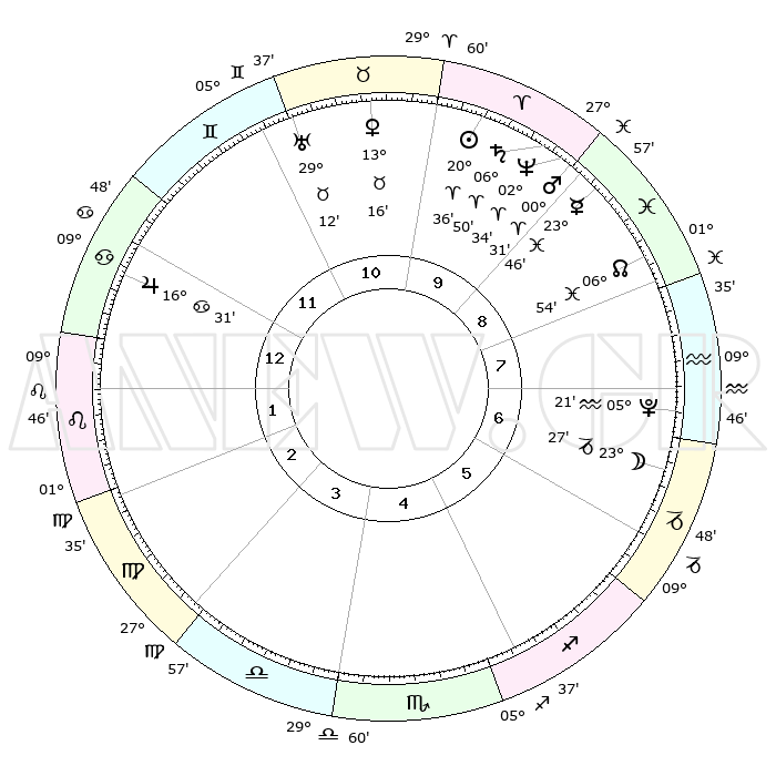 | | ΘΕΣΕΙΣ ΠΛΑΝΗΤΩΝ ΑΣΤΡΟΛΟΓΙΚΟΥ ΧΑΡΤΗ ΤΗΣ ΣΤΙΓΜΗΣ ΑΥΤΗΣ | | | | Πλανήτης | Ζώδιο | Μοίρες | Δεκαήμ. | Σε οίκο | Απόκλιση | | Ακμές των οίκων | | Ηλιος | Κριός | 20°46' | Τρίτο | 7 | 08 N 06 | | 1ος | 29°02' | Παρθένος | | Σελήνη | Αιγόκερως | 25°30' | Τρίτο | 4 | 24 S 29 | | 2ος | 25°33' | Ζυγός | | Ερμής | Ιχθείς | 23°59' | Τρίτο | 6 | 04 S 34 | | 3ος | 25°57' | Σκορπιός | | Αφροδίτη | Ταύρος | 13°29' | Δεύτερο | 8 | 15 N 51 | | 4ος | 28°55' | Τοξότης | | Αρης | Κριός | 00°38' | Πρώτο | 7 | 00 S 40 | | 5ος | 01°54' | Υδροχόος | | Δίας | Καρκίνος | 16°32' | Δεύτερο | 10 | 22 N 47 | | 6ος | 02°23' | Ιχθείς | | Κρόνος | Κριός | 06°51' | Πρώτο | 7 | 00 N 45 | | 7ος | 29°02' | Ιχθείς | | Ουρανός | Ταύρος | 29°12' | Τρίτο | 9 | 19 N 49 | | 8ος | 25°33' | Κριός | | Ποσειδώνας | Κριός | 02°34' | Πρώτο | 7 | 00 S 11 | | 9ος | 25°57' | Ταύρος | | Πλούτωνας | Υδροχόος | 05°21' | Πρώτο | 5 | 22 S 47 | | 10ος | 28°55' | Δίδυμοι | | Β. Δεσμός | Ιχθείς | 06°54' | Πρώτο | 6 | 08 S 59 | | 11ος | 01°54' | Λέων | | Ωροσκόπος | Παρθένος | 29°02' | Τρίτο | | | 12ος | 02°23' | Παρθένος | | Μεσουράνημα | Δίδυμοι | 28°55' | Τρίτο | | | |