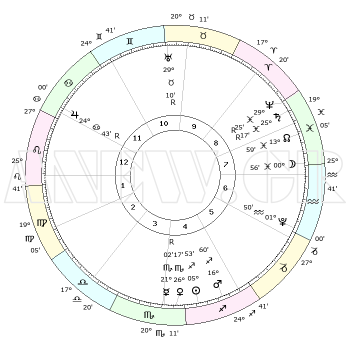 | | ΘΕΣΕΙΣ ΠΛΑΝΗΤΩΝ ΑΣΤΡΟΛΟΓΙΚΟΥ ΧΑΡΤΗ ΤΗΣ ΣΤΙΓΜΗΣ ΑΥΤΗΣ | | | | Πλανήτης | Ζώδιο | Μοίρες | Δεκαήμ. | Σε οίκο | Απόκλιση | | Ακμές των οίκων | | Ηλιος | Τοξότης | 05°19' | Πρώτο | 11 | 21 S 11 | | 1ος | 09°42' | Αιγόκερως | | Σελήνη | Υδροχόος | 23°52' | Τρίτο | 2 | 15 S 14 | | 2ος | 19°20' | Υδροχόος | | Ερμής | Σκορπιός | 21°15'R | Τρίτο | 10 | 15 S 50 | | 3ος | 29°38' | Ιχθείς | | Αφροδίτη | Σκορπιός | 25°36' | Τρίτο | 10 | 18 S 21 | | 4ος | 01°52' | Ταύρος | | Αρης | Τοξότης | 16°35' | Δεύτερο | 11 | 23 S 23 | | 5ος | 26°45' | Ταύρος | | Δίας | Καρκίνος | 24°45'R | Τρίτο | 7 | 21 N 19 | | 6ος | 18°05' | Δίδυμοι | | Κρόνος | Ιχθείς | 25°17'R | Τρίτο | 2 | 04 S 04 | | 7ος | 09°42' | Καρκίνος | | Ουρανός | Ταύρος | 29°12'R | Τρίτο | 5 | 19 N 46 | | 8ος | 19°20' | Λέων | | Ποσειδώνας | Ιχθείς | 29°25'R | Τρίτο | 2 | 01 S 28 | | 9ος | 29°38' | Παρθένος | | Πλούτωνας | Υδροχόος | 01°50' | Πρώτο | 1 | 23 S 25 | | 10ος | 01°52' | Σκορπιός | | Β. Δεσμός | Ιχθείς | 14°00' | Δεύτερο | 2 | 06 S 17 | | 11ος | 26°45' | Σκορπιός | | Ωροσκόπος | Αιγόκερως | 09°42' | Πρώτο | | | 12ος | 18°05' | Τοξότης | | Μεσουράνημα | Σκορπιός | 01°52' | Πρώτο | | | |