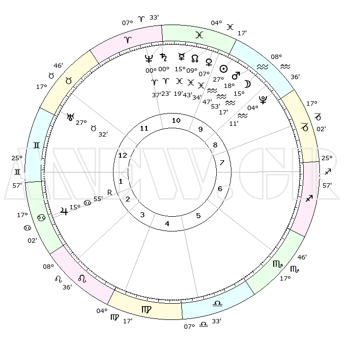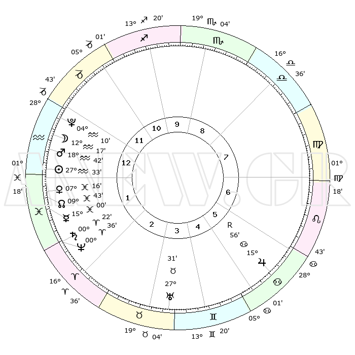 | | ΘΕΣΕΙΣ ΠΛΑΝΗΤΩΝ ΑΣΤΡΟΛΟΓΙΚΟΥ ΧΑΡΤΗ ΤΗΣ ΣΤΙΓΜΗΣ ΑΥΤΗΣ | | | | Πλανήτης | Ζώδιο | Μοίρες | Δεκαήμ. | Σε οίκο | Απόκλιση | | Ακμές των οίκων | | Ηλιος | Υδροχόος | 27°29' | Τρίτο | 1 | 12 S 21 | | 1ος | 27°60' | Αιγόκερως | | Σελήνη | Υδροχόος | 11°23' | Δεύτερο | 1 | 19 S 43 | | 2ος | 11°45' | Ιχθείς | | Ερμής | Ιχθείς | 14°55' | Δεύτερο | 2 | 05 S 39 | | 3ος | 20°30' | Κριός | | Αφροδίτη | Ιχθείς | 07°11' | Πρώτο | 1 | 10 S 14 | | 4ος | 19°19' | Ταύρος | | Αρης | Υδροχόος | 18°38' | Δεύτερο | 1 | 16 S 16 | | 5ος | 12°14' | Δίδυμοι | | Δίας | Καρκίνος | 15°56'R | Δεύτερο | 6 | 22 N 48 | | 6ος | 03°35' | Καρκίνος | | Κρόνος | Κριός | 00°21' | Πρώτο | 2 | 01 S 50 | | 7ος | 27°60' | Καρκίνος | | Ουρανός | Ταύρος | 27°31' | Τρίτο | 4 | 19 N 25 | | 8ος | 11°45' | Παρθένος | | Ποσειδώνας | Κριός | 00°36' | Πρώτο | 2 | 00 S 58 | | 9ος | 20°30' | Ζυγός | | Πλούτωνας | Υδροχόος | 04°10' | Πρώτο | 1 | 22 S 56 | | 10ος | 19°19' | Σκορπιός | | Β. Δεσμός | Ιχθείς | 09°44' | Πρώτο | 1 | 07 S 55 | | 11ος | 12°14' | Τοξότης | | Ωροσκόπος | Αιγόκερως | 27°60' | Τρίτο | | | 12ος | 03°35' | Αιγόκερως | | Μεσουράνημα | Σκορπιός | 19°19' | Δεύτερο | | | |