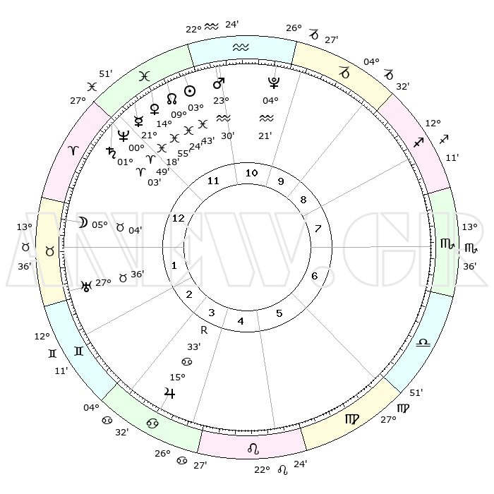 | | ΘΕΣΕΙΣ ΠΛΑΝΗΤΩΝ ΑΣΤΡΟΛΟΓΙΚΟΥ ΧΑΡΤΗ ΤΗΣ ΣΤΙΓΜΗΣ ΑΥΤΗΣ | | | | Πλανήτης | Ζώδιο | Μοίρες | Δεκαήμ. | Σε οίκο | Απόκλιση | | Ακμές των οίκων | | Ηλιος | Ιχθείς | 03°39' | Πρώτο | 12 | 10 S 10 | | 1ος | 04°44' | Κριός | | Σελήνη | Ταύρος | 04°04' | Πρώτο | 1 | 16 N 57 | | 2ος | 13°51' | Ταύρος | | Ερμής | Ιχθείς | 21°16' | Τρίτο | 12 | 01 S 47 | | 3ος | 10°32' | Δίδυμοι | | Αφροδίτη | Ιχθείς | 14°50' | Δεύτερο | 12 | 07 S 18 | | 4ος | 02°39' | Καρκίνος | | Αρης | Υδροχόος | 23°27' | Τρίτο | 12 | 14 S 44 | | 5ος | 25°11' | Καρκίνος | | Δίας | Καρκίνος | 15°33'R | Δεύτερο | 4 | 22 N 52 | | 6ος | 23°20' | Λέων | | Κρόνος | Κριός | 01°03' | Πρώτο | 12 | 01 S 33 | | 7ος | 04°43' | Ζυγός | | Ουρανός | Ταύρος | 27°36' | Τρίτο | 2 | 19 N 27 | | 8ος | 13°51' | Σκορπιός | | Ποσειδώνας | Κριός | 00°49' | Πρώτο | 12 | 00 S 53 | | 9ος | 10°32' | Τοξότης | | Πλούτωνας | Υδροχόος | 04°21' | Πρώτο | 11 | 22 S 54 | | 10ος | 02°39' | Αιγόκερως | | Β. Δεσμός | Ιχθείς | 09°24' | Πρώτο | 12 | 08 S 03 | | 11ος | 25°11' | Αιγόκερως | | Ωροσκόπος | Κριός | 04°44' | Πρώτο | | | 12ος | 23°20' | Υδροχόος | | Μεσουράνημα | Αιγόκερως | 02°39' | Πρώτο | | | |
