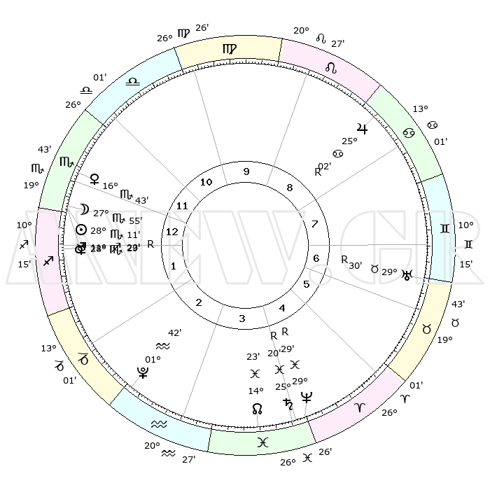 | | ΘΕΣΕΙΣ ΠΛΑΝΗΤΩΝ ΑΣΤΡΟΛΟΓΙΚΟΥ ΧΑΡΤΗ ΤΗΣ ΣΤΙΓΜΗΣ ΑΥΤΗΣ | | | | Πλανήτης | Ζώδιο | Μοίρες | Δεκαήμ. | Σε οίκο | Απόκλιση | | Ακμές των οίκων | | Ηλιος | Σκορπιός | 28°40' | Τρίτο | 5 | 19 S 51 | | 1ος | 10°24' | Καρκίνος | | Σελήνη | Τοξότης | 03°41' | Πρώτο | 5 | 25 S 42 | | 2ος | 00°49' | Λέων | | Ερμής | Σκορπιός | 27°49'R | Τρίτο | 5 | 19 S 01 | | 3ος | 23°29' | Λέων | | Αφροδίτη | Σκορπιός | 17°19' | Δεύτερο | 5 | 16 S 00 | | 4ος | 21°31' | Παρθένος | | Αρης | Τοξότης | 11°45' | Δεύτερο | 6 | 22 S 46 | | 5ος | 26°50' | Ζυγός | | Δίας | Καρκίνος | 25°01'R | Τρίτο | 1 | 21 N 15 | | 6ος | 05°43' | Τοξότης | | Κρόνος | Ιχθείς | 25°20'R | Τρίτο | 10 | 04 S 04 | | 7ος | 10°24' | Αιγόκερως | | Ουρανός | Ταύρος | 29°28'R | Τρίτο | 11 | 19 N 50 | | 8ος | 00°49' | Υδροχόος | | Ποσειδώνας | Ιχθείς | 29°29'R | Τρίτο | 10 | 01 S 27 | | 9ος | 23°29' | Υδροχόος | | Πλούτωνας | Υδροχόος | 01°42' | Πρώτο | 8 | 23 S 27 | | 10ος | 21°31' | Ιχθείς | | Β. Δεσμός | Ιχθείς | 14°21' | Δεύτερο | 9 | 06 S 09 | | 11ος | 26°50' | Κριός | | Ωροσκόπος | Καρκίνος | 10°24' | Δεύτερο | | | 12ος | 05°43' | Δίδυμοι | | Μεσουράνημα | Ιχθείς | 21°31' | Τρίτο | | | |