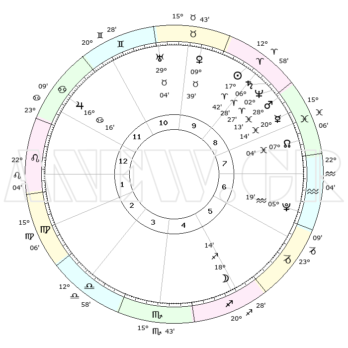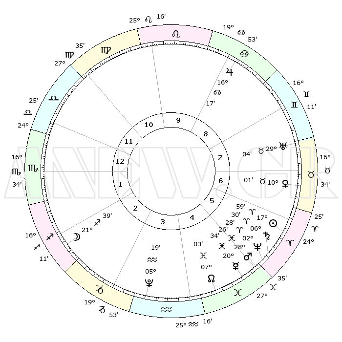 | | ΘΕΣΕΙΣ ΠΛΑΝΗΤΩΝ ΑΣΤΡΟΛΟΓΙΚΟΥ ΧΑΡΤΗ ΤΗΣ ΣΤΙΓΜΗΣ ΑΥΤΗΣ | | | | Πλανήτης | Ζώδιο | Μοίρες | Δεκαήμ. | Σε οίκο | Απόκλιση | | Ακμές των οίκων | | Ηλιος | Κριός | 17°38' | Δεύτερο | 9 | 06 N 55 | | 1ος | 03°34' | Λέων | | Σελήνη | Τοξότης | 17°28' | Δεύτερο | 5 | 27 S 55 | | 2ος | 24°51' | Λέων | | Ερμής | Ιχθείς | 20°10' | Τρίτο | 8 | 05 S 51 | | 3ος | 20°23' | Παρθένος | | Αφροδίτη | Ταύρος | 09°35' | Πρώτο | 10 | 14 N 31 | | 4ος | 21°50' | Ζυγός | | Αρης | Ιχθείς | 28°10' | Τρίτο | 9 | 01 S 40 | | 5ος | 27°46' | Σκορπιός | | Δίας | Καρκίνος | 16°16' | Δεύτερο | 12 | 22 N 49 | | 6ος | 02°54' | Αιγόκερως | | Κρόνος | Κριός | 06°28' | Πρώτο | 9 | 00 N 36 | | 7ος | 03°34' | Υδροχόος | | Ουρανός | Ταύρος | 29°03' | Τρίτο | 11 | 19 N 47 | | 8ος | 24°51' | Υδροχόος | | Ποσειδώνας | Κριός | 02°27' | Πρώτο | 9 | 00 S 14 | | 9ος | 20°23' | Ιχθείς | | Πλούτωνας | Υδροχόος | 05°19' | Πρώτο | 7 | 22 S 47 | | 10ος | 21°50' | Κριός | | Β. Δεσμός | Ιχθείς | 07°04' | Πρώτο | 8 | 08 S 55 | | 11ος | 27°46' | Ταύρος | | Ωροσκόπος | Λέων | 03°34' | Πρώτο | | | 12ος | 02°54' | Καρκίνος | | Μεσουράνημα | Κριός | 21°50' | Τρίτο | | | |