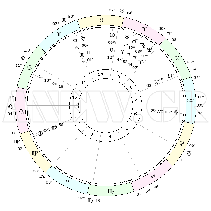 | | ΘΕΣΕΙΣ ΠΛΑΝΗΤΩΝ ΑΣΤΡΟΛΟΓΙΚΟΥ ΧΑΡΤΗ ΤΗΣ ΣΤΙΓΜΗΣ ΑΥΤΗΣ | | | | Πλανήτης | Ζώδιο | Μοίρες | Δεκαήμ. | Σε οίκο | Απόκλιση | | Ακμές των οίκων | | Ηλιος | Ταύρος | 06°09' | Πρώτο | 10 | 13 N 34 | | 1ος | 25°34' | Καρκίνος | | Σελήνη | Παρθένος | 04°13' | Πρώτο | 2 | 10 N 13 | | 2ος | 16°20' | Λέων | | Ερμής | Κριός | 17°39' | Δεύτερο | 10 | 04 N 45 | | 3ος | 10°48' | Παρθένος | | Αφροδίτη | Δίδυμοι | 02°41' | Πρώτο | 11 | 21 N 22 | | 4ος | 11°14' | Ζυγός | | Αρης | Κριός | 12°50' | Δεύτερο | 10 | 04 N 13 | | 5ος | 17°20' | Σκορπιός | | Δίας | Καρκίνος | 18°18' | Δεύτερο | 12 | 22 N 34 | | 6ος | 23°47' | Τοξότης | | Κρόνος | Κριός | 08°44' | Πρώτο | 9 | 01 N 28 | | 7ος | 25°34' | Αιγόκερως | | Ουρανός | Δίδυμοι | 00°01' | Πρώτο | 11 | 19 N 59 | | 8ος | 16°20' | Υδροχόος | | Ποσειδώνας | Κριός | 03°07' | Πρώτο | 9 | 00 N 02 | | 9ος | 10°48' | Ιχθείς | | Πλούτωνας | Υδροχόος | 05°29' | Πρώτο | 7 | 22 S 48 | | 10ος | 11°14' | Κριός | | Β. Δεσμός | Ιχθείς | 06°04' | Πρώτο | 8 | 09 S 17 | | 11ος | 17°20' | Ταύρος | | Ωροσκόπος | Καρκίνος | 25°34' | Τρίτο | | | 12ος | 23°47' | Δίδυμοι | | Μεσουράνημα | Κριός | 11°14' | Δεύτερο | | | |