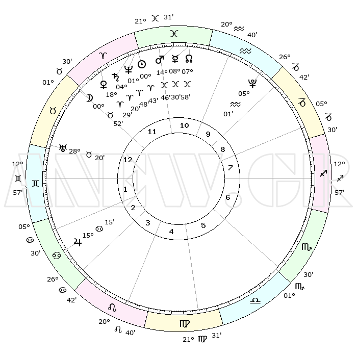 | | ΘΕΣΕΙΣ ΠΛΑΝΗΤΩΝ ΑΣΤΡΟΛΟΓΙΚΟΥ ΧΑΡΤΗ ΤΗΣ ΣΤΙΓΜΗΣ ΑΥΤΗΣ | | | | Πλανήτης | Ζώδιο | Μοίρες | Δεκαήμ. | Σε οίκο | Απόκλιση | | Ακμές των οίκων | | Ηλιος | Κριός | 00°39' | Πρώτο | 12 | 00 N 16 | | 1ος | 11°56' | Ταύρος | | Σελήνη | Κριός | 29°50' | Τρίτο | 12 | 15 N 13 | | 2ος | 10°57' | Δίδυμοι | | Ερμής | Ιχθείς | 08°30' | Πρώτο | 11 | 07 S 34 | | 3ος | 03°25' | Καρκίνος | | Αφροδίτη | Κριός | 18°24' | Δεύτερο | 12 | 06 N 26 | | 4ος | 25°17' | Καρκίνος | | Αρης | Ιχθείς | 14°42' | Δεύτερο | 11 | 07 S 01 | | 5ος | 21°02' | Λέων | | Δίας | Καρκίνος | 15°15' | Δεύτερο | 3 | 22 N 55 | | 6ος | 26°09' | Παρθένος | | Κρόνος | Κριός | 04°19' | Πρώτο | 12 | 00 S 14 | | 7ος | 11°56' | Σκορπιός | | Ουρανός | Ταύρος | 28°20' | Τρίτο | 1 | 19 N 37 | | 8ος | 10°57' | Τοξότης | | Ποσειδώνας | Κριός | 01°48' | Πρώτο | 12 | 00 S 29 | | 9ος | 03°25' | Αιγόκερως | | Πλούτωνας | Υδροχόος | 05°01' | Πρώτο | 10 | 22 S 48 | | 10ος | 25°17' | Αιγόκερως | | Β. Δεσμός | Ιχθείς | 07°58' | Πρώτο | 11 | 08 S 35 | | 11ος | 21°02' | Υδροχόος | | Ωροσκόπος | Ταύρος | 11°56' | Δεύτερο | | | 12ος | 26°09' | Ιχθείς | | Μεσουράνημα | Αιγόκερως | 25°17' | Τρίτο | | | |