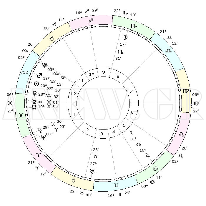| | ΘΕΣΕΙΣ ΠΛΑΝΗΤΩΝ ΑΣΤΡΟΛΟΓΙΚΟΥ ΧΑΡΤΗ ΤΗΣ ΣΤΙΓΜΗΣ ΑΥΤΗΣ | | | | Πλανήτης | Ζώδιο | Μοίρες | Δεκαήμ. | Σε οίκο | Απόκλιση | | Ακμές των οίκων | | Ηλιος | Υδροχόος | 20°27' | Τρίτο | 1 | 14 S 40 | | 1ος | 09°07' | Υδροχόος | | Σελήνη | Σκορπιός | 16°53' | Δεύτερο | 9 | 21 S 32 | | 2ος | 24°25' | Ιχθείς | | Ερμής | Ιχθείς | 03°56' | Πρώτο | 1 | 11 S 01 | | 3ος | 01°16' | Ταύρος | | Αφροδίτη | Υδροχόος | 28°28' | Τρίτο | 1 | 13 S 22 | | 4ος | 28°16' | Ταύρος | | Αρης | Υδροχόος | 13°10' | Δεύτερο | 1 | 17 S 53 | | 5ος | 20°28' | Δίδυμοι | | Δίας | Καρκίνος | 16°31'R | Δεύτερο | 6 | 22 N 44 | | 6ος | 12°19' | Καρκίνος | | Κρόνος | Ιχθείς | 29°36' | Τρίτο | 2 | 02 S 08 | | 7ος | 09°07' | Λέων | | Ουρανός | Ταύρος | 27°28' | Τρίτο | 3 | 19 N 24 | | 8ος | 24°25' | Παρθένος | | Ποσειδώνας | Κριός | 00°23' | Πρώτο | 2 | 01 S 03 | | 9ος | 01°16' | Σκορπιός | | Πλούτωνας | Υδροχόος | 03°58' | Πρώτο | 12 | 22 S 58 | | 10ος | 28°16' | Σκορπιός | | Β. Δεσμός | Ιχθείς | 10°06' | Δεύτερο | 1 | 07 S 47 | | 11ος | 20°28' | Τοξότης | | Ωροσκόπος | Υδροχόος | 09°07' | Πρώτο | | | 12ος | 12°19' | Αιγόκερως | | Μεσουράνημα | Σκορπιός | 28°16' | Τρίτο | | | |