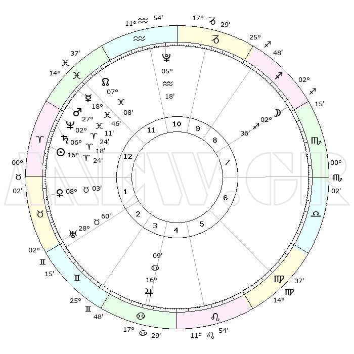 | | ΘΕΣΕΙΣ ΠΛΑΝΗΤΩΝ ΑΣΤΡΟΛΟΓΙΚΟΥ ΧΑΡΤΗ ΤΗΣ ΣΤΙΓΜΗΣ ΑΥΤΗΣ | | | | Πλανήτης | Ζώδιο | Μοίρες | Δεκαήμ. | Σε οίκο | Απόκλιση | | Ακμές των οίκων | | Ηλιος | Κριός | 16°16' | Δεύτερο | 2 | 06 N 24 | | 1ος | 09°49' | Υδροχόος | | Σελήνη | Τοξότης | 00°52' | Πρώτο | 10 | 25 S 20 | | 2ος | 25°11' | Ιχθείς | | Ερμής | Ιχθείς | 18°36' | Δεύτερο | 1 | 06 S 19 | | 3ος | 01°54' | Ταύρος | | Αφροδίτη | Ταύρος | 07°52' | Πρώτο | 3 | 13 N 55 | | 4ος | 28°47' | Ταύρος | | Αρης | Ιχθείς | 27°04' | Τρίτο | 2 | 02 S 06 | | 5ος | 20°58' | Δίδυμοι | | Δίας | Καρκίνος | 16°09' | Δεύτερο | 6 | 22 N 50 | | 6ος | 12°51' | Καρκίνος | | Κρόνος | Κριός | 06°17' | Πρώτο | 2 | 00 N 32 | | 7ος | 09°49' | Λέων | | Ουρανός | Ταύρος | 28°59' | Τρίτο | 4 | 19 N 46 | | 8ος | 25°11' | Παρθένος | | Ποσειδώνας | Κριός | 02°24' | Πρώτο | 2 | 00 S 15 | | 9ος | 01°54' | Σκορπιός | | Πλούτωνας | Υδροχόος | 05°18' | Πρώτο | 12 | 22 S 47 | | 10ος | 28°47' | Σκορπιός | | Β. Δεσμός | Ιχθείς | 07°08' | Πρώτο | 1 | 08 S 53 | | 11ος | 20°58' | Τοξότης | | Ωροσκόπος | Υδροχόος | 09°49' | Πρώτο | | | 12ος | 12°51' | Αιγόκερως | | Μεσουράνημα | Σκορπιός | 28°47' | Τρίτο | | | |
