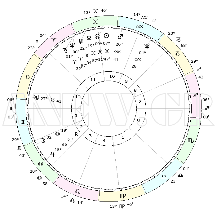 | | ΘΕΣΕΙΣ ΠΛΑΝΗΤΩΝ ΑΣΤΡΟΛΟΓΙΚΟΥ ΧΑΡΤΗ ΤΗΣ ΣΤΙΓΜΗΣ ΑΥΤΗΣ | | | | Πλανήτης | Ζώδιο | Μοίρες | Δεκαήμ. | Σε οίκο | Απόκλιση | | Ακμές των οίκων | | Ηλιος | Ιχθείς | 07°43' | Πρώτο | 11 | 08 S 40 | | 1ος | 10°24' | Ταύρος | | Σελήνη | Καρκίνος | 01°31' | Πρώτο | 2 | 28 N 18 | | 2ος | 09°49' | Δίδυμοι | | Ερμής | Ιχθείς | 22°34' | Τρίτο | 11 | 00 S 23 | | 3ος | 02°25' | Καρκίνος | | Αφροδίτη | Ιχθείς | 19°53' | Δεύτερο | 11 | 05 S 17 | | 4ος | 24°14' | Καρκίνος | | Αρης | Υδροχόος | 26°39' | Τρίτο | 11 | 13 S 39 | | 5ος | 19°48' | Λέων | | Δίας | Καρκίνος | 15°21'R | Δεύτερο | 3 | 22 N 53 | | 6ος | 24°35' | Παρθένος | | Κρόνος | Κριός | 01°31' | Πρώτο | 12 | 01 S 21 | | 7ος | 10°24' | Σκορπιός | | Ουρανός | Ταύρος | 27°41' | Τρίτο | 1 | 19 N 28 | | 8ος | 09°49' | Τοξότης | | Ποσειδώνας | Κριός | 00°57' | Πρώτο | 12 | 00 S 49 | | 9ος | 02°25' | Αιγόκερως | | Πλούτωνας | Υδροχόος | 04°28' | Πρώτο | 10 | 22 S 53 | | 10ος | 24°14' | Αιγόκερως | | Β. Δεσμός | Ιχθείς | 09°11' | Πρώτο | 11 | 08 S 07 | | 11ος | 19°48' | Υδροχόος | | Ωροσκόπος | Ταύρος | 10°24' | Δεύτερο | | | 12ος | 24°35' | Ιχθείς | | Μεσουράνημα | Αιγόκερως | 24°14' | Τρίτο | | | |