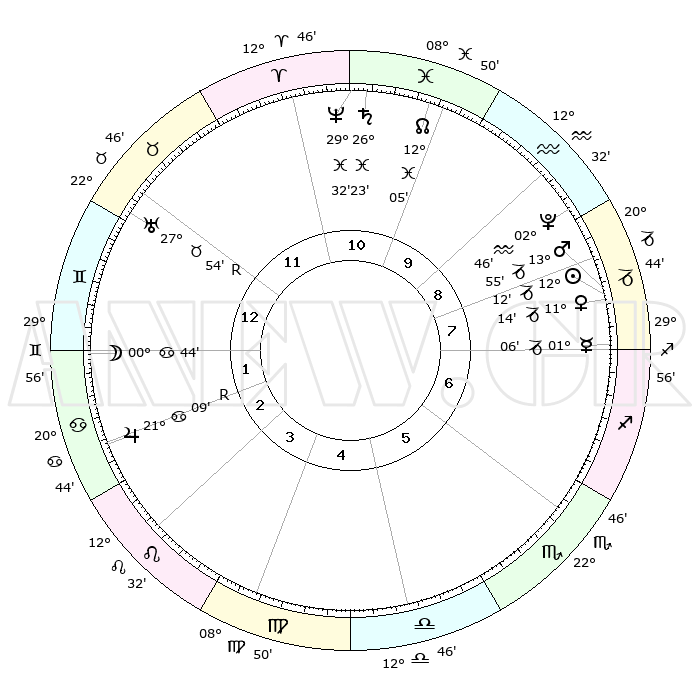 | | ΘΕΣΕΙΣ ΠΛΑΝΗΤΩΝ ΑΣΤΡΟΛΟΓΙΚΟΥ ΧΑΡΤΗ ΤΗΣ ΣΤΙΓΜΗΣ ΑΥΤΗΣ | | | | Πλανήτης | Ζώδιο | Μοίρες | Δεκαήμ. | Σε οίκο | Απόκλιση | | Ακμές των οίκων | | Ηλιος | Αιγόκερως | 12°07' | Δεύτερο | 8 | 22 S 53 | | 1ος | 02°34' | Δίδυμοι | | Σελήνη | Δίδυμοι | 29°37' | Τρίτο | 2 | 28 N 14 | | 2ος | 26°52' | Δίδυμοι | | Ερμής | Αιγόκερως | 00°60' | Πρώτο | 8 | 24 S 10 | | 3ος | 18°12' | Καρκίνος | | Αφροδίτη | Αιγόκερως | 11°08' | Δεύτερο | 8 | 23 S 32 | | 4ος | 11°10' | Λέων | | Αρης | Αιγόκερως | 13°52' | Δεύτερο | 8 | 23 S 36 | | 5ος | 10°05' | Παρθένος | | Δίας | Καρκίνος | 21°09'R | Τρίτο | 3 | 22 N 01 | | 6ος | 18°55' | Ζυγός | | Κρόνος | Ιχθείς | 26°23' | Τρίτο | 11 | 03 S 31 | | 7ος | 02°34' | Τοξότης | | Ουρανός | Ταύρος | 27°54'R | Τρίτο | 12 | 19 N 30 | | 8ος | 26°52' | Τοξότης | | Ποσειδώνας | Ιχθείς | 29°32' | Τρίτο | 11 | 01 S 25 | | 9ος | 18°12' | Αιγόκερως | | Πλούτωνας | Υδροχόος | 02°46' | Πρώτο | 9 | 23 S 13 | | 10ος | 11°10' | Υδροχόος | | Β. Δεσμός | Ιχθείς | 12°05' | Δεύτερο | 11 | 07 S 02 | | 11ος | 10°05' | Ιχθείς | | Ωροσκόπος | Δίδυμοι | 02°34' | Πρώτο | | | 12ος | 18°55' | Κριός | | Μεσουράνημα | Υδροχόος | 11°10' | Δεύτερο | | | |