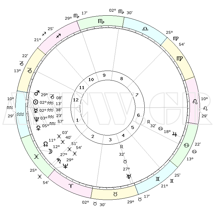 | | ΘΕΣΕΙΣ ΠΛΑΝΗΤΩΝ ΑΣΤΡΟΛΟΓΙΚΟΥ ΧΑΡΤΗ ΤΗΣ ΣΤΙΓΜΗΣ ΑΥΤΗΣ | | | | Πλανήτης | Ζώδιο | Μοίρες | Δεκαήμ. | Σε οίκο | Απόκλιση | | Ακμές των οίκων | | Ηλιος | Υδροχόος | 02°09' | Πρώτο | 1 | 19 S 41 | | 1ος | 11°30' | Αιγόκερως | | Σελήνη | Ιχθείς | 11°45' | Δεύτερο | 2 | 06 S 57 | | 2ος | 21°35' | Υδροχόος | | Ερμής | Υδροχόος | 02°31' | Πρώτο | 1 | 21 S 36 | | 3ος | 01°51' | Κριός | | Αφροδίτη | Υδροχόος | 05°52' | Πρώτο | 1 | 19 S 56 | | 4ος | 03°44' | Ταύρος | | Αρης | Αιγόκερως | 29°04' | Τρίτο | 1 | 21 S 19 | | 5ος | 28°23' | Ταύρος | | Δίας | Καρκίνος | 18°32'R | Δεύτερο | 7 | 22 N 26 | | 6ος | 19°40' | Δίδυμοι | | Κρόνος | Ιχθείς | 27°51' | Τρίτο | 2 | 02 S 52 | | 7ος | 11°30' | Καρκίνος | | Ουρανός | Ταύρος | 27°32'R | Τρίτο | 4 | 19 N 25 | | 8ος | 21°35' | Λέων | | Ποσειδώνας | Ιχθείς | 29°54' | Τρίτο | 2 | 01 S 15 | | 9ος | 01°51' | Ζυγός | | Πλούτωνας | Υδροχόος | 03°23' | Πρώτο | 1 | 23 S 05 | | 10ος | 03°44' | Σκορπιός | | Β. Δεσμός | Ιχθείς | 11°03' | Δεύτερο | 2 | 07 S 25 | | 11ος | 28°23' | Σκορπιός | | Ωροσκόπος | Αιγόκερως | 11°30' | Δεύτερο | | | 12ος | 19°41' | Τοξότης | | Μεσουράνημα | Σκορπιός | 03°44' | Πρώτο | | | |
