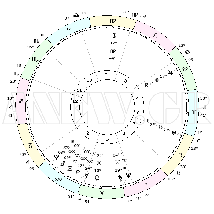 | | ΘΕΣΕΙΣ ΠΛΑΝΗΤΩΝ ΑΣΤΡΟΛΟΓΙΚΟΥ ΧΑΡΤΗ ΤΗΣ ΣΤΙΓΜΗΣ ΑΥΤΗΣ | | | | Πλανήτης | Ζώδιο | Μοίρες | Δεκαήμ. | Σε οίκο | Απόκλιση | | Ακμές των οίκων | | Ηλιος | Υδροχόος | 15°12' | Δεύτερο | 3 | 16 S 16 | | 1ος | 02°36' | Τοξότης | | Σελήνη | Παρθένος | 12°01' | Δεύτερο | 9 | 06 N 48 | | 2ος | 04°06' | Αιγόκερως | | Ερμής | Υδροχόος | 24°51' | Τρίτο | 3 | 14 S 48 | | 3ος | 10°14' | Υδροχόος | | Αφροδίτη | Υδροχόος | 21°59' | Τρίτο | 3 | 15 S 30 | | 4ος | 16°19' | Ιχθείς | | Αρης | Υδροχόος | 09°06' | Πρώτο | 2 | 18 S 59 | | 5ος | 17°01' | Κριός | | Δίας | Καρκίνος | 17°02'R | Δεύτερο | 8 | 22 N 39 | | 6ος | 11°43' | Ταύρος | | Κρόνος | Ιχθείς | 29°04' | Τρίτο | 4 | 02 S 22 | | 7ος | 02°36' | Δίδυμοι | | Ουρανός | Ταύρος | 27°27'R | Τρίτο | 6 | 19 N 24 | | 8ος | 04°06' | Καρκίνος | | Ποσειδώνας | Κριός | 00°14' | Πρώτο | 4 | 01 S 07 | | 9ος | 10°14' | Λέων | | Πλούτωνας | Υδροχόος | 03°48' | Πρώτο | 2 | 23 S 00 | | 10ος | 16°19' | Παρθένος | | Β. Δεσμός | Ιχθείς | 10°22' | Δεύτερο | 3 | 07 S 41 | | 11ος | 17°01' | Ζυγός | | Ωροσκόπος | Τοξότης | 02°36' | Πρώτο | | | 12ος | 11°43' | Σκορπιός | | Μεσουράνημα | Παρθένος | 16°19' | Δεύτερο | | | |