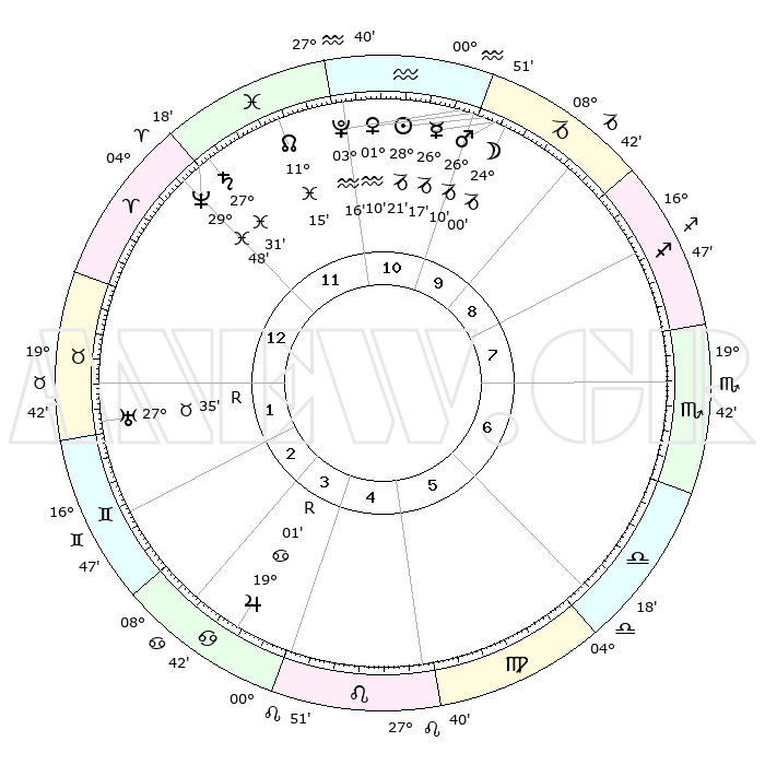 | | ΘΕΣΕΙΣ ΠΛΑΝΗΤΩΝ ΑΣΤΡΟΛΟΓΙΚΟΥ ΧΑΡΤΗ ΤΗΣ ΣΤΙΓΜΗΣ ΑΥΤΗΣ | | | | Πλανήτης | Ζώδιο | Μοίρες | Δεκαήμ. | Σε οίκο | Απόκλιση | | Ακμές των οίκων | | Ηλιος | Αιγόκερως | 28°17' | Τρίτο | 10 | 20 S 30 | | 1ος | 15°25' | Κριός | | Σελήνη | Αιγόκερως | 23°12' | Τρίτο | 10 | 25 S 07 | | 2ος | 21°41' | Ταύρος | | Ερμής | Αιγόκερως | 26°10' | Τρίτο | 10 | 22 S 50 | | 3ος | 16°55' | Δίδυμοι | | Αφροδίτη | Υδροχόος | 01°05' | Πρώτο | 10 | 20 S 58 | | 4ος | 08°44' | Καρκίνος | | Αρης | Αιγόκερως | 26°07' | Τρίτο | 10 | 21 S 53 | | 5ος | 01°55' | Λέων | | Δίας | Καρκίνος | 19°02'R | Δεύτερο | 4 | 22 N 21 | | 6ος | 01°52' | Παρθένος | | Κρόνος | Ιχθείς | 27°31' | Τρίτο | 12 | 03 S 01 | | 7ος | 15°25' | Ζυγός | | Ουρανός | Ταύρος | 27°35'R | Τρίτο | 2 | 19 N 26 | | 8ος | 21°41' | Σκορπιός | | Ποσειδώνας | Ιχθείς | 29°48' | Τρίτο | 12 | 01 S 17 | | 9ος | 16°56' | Τοξότης | | Πλούτωνας | Υδροχόος | 03°16' | Πρώτο | 11 | 23 S 06 | | 10ος | 08°44' | Αιγόκερως | | Β. Δεσμός | Ιχθείς | 11°15' | Δεύτερο | 12 | 07 S 21 | | 11ος | 01°55' | Υδροχόος | | Ωροσκόπος | Κριός | 15°25' | Δεύτερο | | | 12ος | 01°52' | Ιχθείς | | Μεσουράνημα | Αιγόκερως | 08°44' | Πρώτο | | | |