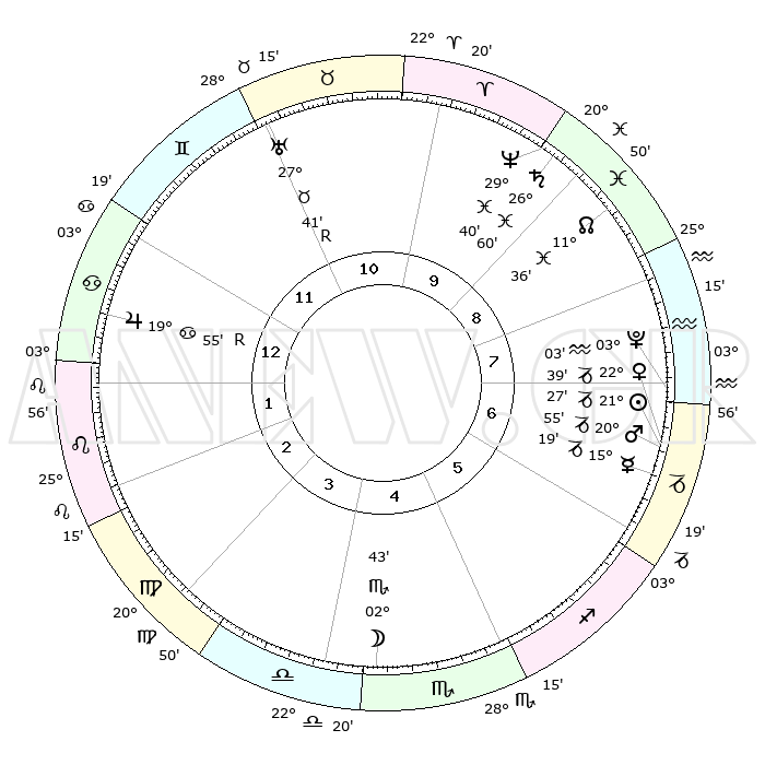 | | ΘΕΣΕΙΣ ΠΛΑΝΗΤΩΝ ΑΣΤΡΟΛΟΓΙΚΟΥ ΧΑΡΤΗ ΤΗΣ ΣΤΙΓΜΗΣ ΑΥΤΗΣ | | | | Πλανήτης | Ζώδιο | Μοίρες | Δεκαήμ. | Σε οίκο | Απόκλιση | | Ακμές των οίκων | | Ηλιος | Αιγόκερως | 21°07' | Τρίτο | 11 | 21 S 46 | | 1ος | 15°55' | Ιχθείς | | Σελήνη | Ζυγός | 28°46' | Τρίτο | 7 | 14 S 37 | | 2ος | 29°13' | Κριός | | Ερμής | Αιγόκερως | 14°47' | Δεύτερο | 11 | 24 S 09 | | 3ος | 28°57' | Ταύρος | | Αφροδίτη | Αιγόκερως | 22°14' | Τρίτο | 11 | 22 S 27 | | 4ος | 22°02' | Δίδυμοι | | Αρης | Αιγόκερως | 20°40' | Τρίτο | 11 | 22 S 47 | | 5ος | 13°52' | Καρκίνος | | Δίας | Καρκίνος | 19°58'R | Δεύτερο | 5 | 22 N 12 | | 6ος | 09°17' | Λέων | | Κρόνος | Ιχθείς | 26°58' | Τρίτο | 1 | 03 S 15 | | 7ος | 15°55' | Παρθένος | | Ουρανός | Ταύρος | 27°42'R | Τρίτο | 2 | 19 N 27 | | 8ος | 29°13' | Ζυγός | | Ποσειδώνας | Ιχθείς | 29°40' | Τρίτο | 1 | 01 S 21 | | 9ος | 28°57' | Σκορπιός | | Πλούτωνας | Υδροχόος | 03°03' | Πρώτο | 11 | 23 S 09 | | 10ος | 22°02' | Τοξότης | | Β. Δεσμός | Ιχθείς | 11°37' | Δεύτερο | 12 | 07 S 12 | | 11ος | 13°52' | Αιγόκερως | | Ωροσκόπος | Ιχθείς | 15°55' | Δεύτερο | | | 12ος | 09°17' | Υδροχόος | | Μεσουράνημα | Τοξότης | 22°02' | Τρίτο | | | |