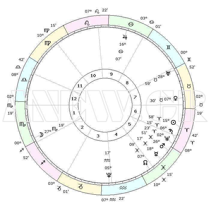 | | ΘΕΣΕΙΣ ΠΛΑΝΗΤΩΝ ΑΣΤΡΟΛΟΓΙΚΟΥ ΧΑΡΤΗ ΤΗΣ ΣΤΙΓΜΗΣ ΑΥΤΗΣ | | | | Πλανήτης | Ζώδιο | Μοίρες | Δεκαήμ. | Σε οίκο | Απόκλιση | | Ακμές των οίκων | | Ηλιος | Κριός | 15°53' | Δεύτερο | 7 | 06 N 15 | | 1ος | 07°18' | Ζυγός | | Σελήνη | Σκορπιός | 26°18' | Τρίτο | 2 | 24 S 14 | | 2ος | 04°23' | Σκορπιός | | Ερμής | Ιχθείς | 18°12' | Δεύτερο | 6 | 06 S 27 | | 3ος | 05°06' | Τοξότης | | Αφροδίτη | Ταύρος | 07°24' | Πρώτο | 8 | 13 N 45 | | 4ος | 08°12' | Αιγόκερως | | Αρης | Ιχθείς | 26°47' | Τρίτο | 6 | 02 S 13 | | 5ος | 11°08' | Υδροχόος | | Δίας | Καρκίνος | 16°07' | Δεύτερο | 10 | 22 N 50 | | 6ος | 11°16' | Ιχθείς | | Κρόνος | Κριός | 06°15' | Πρώτο | 6 | 00 N 31 | | 7ος | 07°18' | Κριός | | Ουρανός | Ταύρος | 28°58' | Τρίτο | 8 | 19 N 45 | | 8ος | 04°23' | Ταύρος | | Ποσειδώνας | Κριός | 02°23' | Πρώτο | 6 | 00 S 15 | | 9ος | 05°06' | Δίδυμοι | | Πλούτωνας | Υδροχόος | 05°17' | Πρώτο | 4 | 22 S 47 | | 10ος | 08°12' | Καρκίνος | | Β. Δεσμός | Ιχθείς | 07°09' | Πρώτο | 5 | 08 S 53 | | 11ος | 11°08' | Λέων | | Ωροσκόπος | Ζυγός | 07°18' | Πρώτο | | | 12ος | 11°17' | Παρθένος | | Μεσουράνημα | Καρκίνος | 08°12' | Πρώτο | | | |