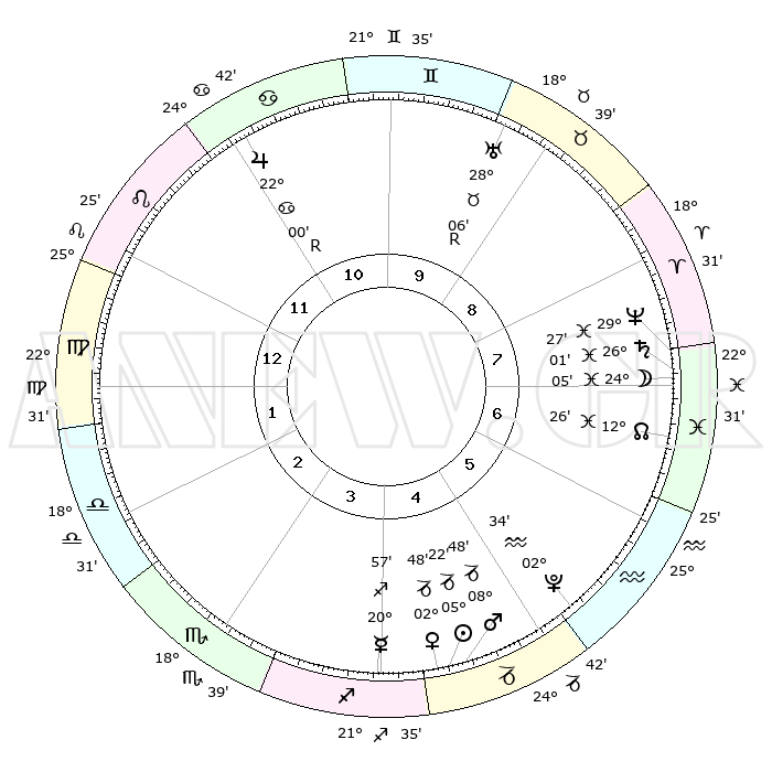 | | ΘΕΣΕΙΣ ΠΛΑΝΗΤΩΝ ΑΣΤΡΟΛΟΓΙΚΟΥ ΧΑΡΤΗ ΤΗΣ ΣΤΙΓΜΗΣ ΑΥΤΗΣ | | | | Πλανήτης | Ζώδιο | Μοίρες | Δεκαήμ. | Σε οίκο | Απόκλιση | | Ακμές των οίκων | | Ηλιος | Αιγόκερως | 05°17' | Πρώτο | 5 | 23 S 20 | | 1ος | 29°19' | Λέων | | Σελήνη | Ιχθείς | 23°01' | Τρίτο | 7 | 01 S 49 | | 2ος | 23°06' | Παρθένος | | Ερμής | Τοξότης | 20°50' | Τρίτο | 4 | 23 S 05 | | 3ος | 21°43' | Ζυγός | | Αφροδίτη | Αιγόκερως | 02°42' | Πρώτο | 5 | 23 S 43 | | 4ος | 24°37' | Σκορπιός | | Αρης | Αιγόκερως | 08°44' | Πρώτο | 5 | 24 S 00 | | 5ος | 28°51' | Τοξότης | | Δίας | Καρκίνος | 22°01'R | Τρίτο | 11 | 21 N 51 | | 6ος | 00°52' | Υδροχόος | | Κρόνος | Ιχθείς | 26°00' | Τρίτο | 8 | 03 S 41 | | 7ος | 29°19' | Υδροχόος | | Ουρανός | Ταύρος | 28°06'R | Τρίτο | 10 | 19 N 32 | | 8ος | 23°06' | Ιχθείς | | Ποσειδώνας | Ιχθείς | 29°27' | Τρίτο | 8 | 01 S 27 | | 9ος | 21°43' | Κριός | | Πλούτωνας | Υδροχόος | 02°34' | Πρώτο | 6 | 23 S 15 | | 10ος | 24°37' | Ταύρος | | Β. Δεσμός | Ιχθείς | 12°27' | Δεύτερο | 7 | 06 S 53 | | 11ος | 28°51' | Δίδυμοι | | Ωροσκόπος | Λέων | 29°19' | Τρίτο | | | 12ος | 00°52' | Λέων | | Μεσουράνημα | Ταύρος | 24°37' | Τρίτο | | | |