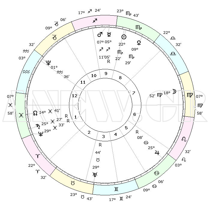 | | ΘΕΣΕΙΣ ΠΛΑΝΗΤΩΝ ΑΣΤΡΟΛΟΓΙΚΟΥ ΧΑΡΤΗ ΤΗΣ ΣΤΙΓΜΗΣ ΑΥΤΗΣ | | | | Πλανήτης | Ζώδιο | Μοίρες | Δεκαήμ. | Σε οίκο | Απόκλιση | | Ακμές των οίκων | | Ηλιος | Σκορπιός | 22°18' | Τρίτο | 9 | 18 S 20 | | 1ος | 03°10' | Υδροχόος | | Σελήνη | Παρθένος | 18°01' | Δεύτερο | 8 | 04 N 35 | | 2ος | 17°46' | Ιχθείς | | Ερμής | Τοξότης | 05°09'R | Πρώτο | 10 | 22 S 31 | | 3ος | 25°41' | Κριός | | Αφροδίτη | Σκορπιός | 09°23' | Πρώτο | 9 | 13 S 28 | | 4ος | 23°37' | Ταύρος | | Αρης | Τοξότης | 07°08' | Πρώτο | 10 | 22 S 00 | | 5ος | 16°09' | Δίδυμοι | | Δίας | Καρκίνος | 25°08'R | Τρίτο | 6 | 21 N 13 | | 6ος | 07°42' | Καρκίνος | | Κρόνος | Ιχθείς | 25°27'R | Τρίτο | 2 | 04 S 02 | | 7ος | 03°10' | Λέων | | Ουρανός | Ταύρος | 29°44'R | Τρίτο | 4 | 19 N 53 | | 8ος | 17°46' | Παρθένος | | Ποσειδώνας | Ιχθείς | 29°34'R | Τρίτο | 2 | 01 S 26 | | 9ος | 25°41' | Ζυγός | | Πλούτωνας | Υδροχόος | 01°36' | Πρώτο | 12 | 23 S 28 | | 10ος | 23°37' | Σκορπιός | | Β. Δεσμός | Ιχθείς | 14°41' | Δεύτερο | 1 | 06 S 02 | | 11ος | 16°09' | Τοξότης | | Ωροσκόπος | Υδροχόος | 03°10' | Πρώτο | | | 12ος | 07°42' | Αιγόκερως | | Μεσουράνημα | Σκορπιός | 23°37' | Τρίτο | | | |