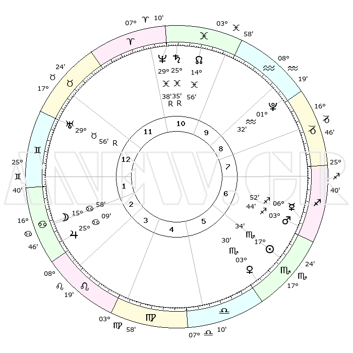 | | ΘΕΣΕΙΣ ΠΛΑΝΗΤΩΝ ΑΣΤΡΟΛΟΓΙΚΟΥ ΧΑΡΤΗ ΤΗΣ ΣΤΙΓΜΗΣ ΑΥΤΗΣ | | | | Πλανήτης | Ζώδιο | Μοίρες | Δεκαήμ. | Σε οίκο | Απόκλιση | | Ακμές των οίκων | | Ηλιος | Σκορπιός | 17°26' | Δεύτερο | 7 | 17 S 02 | | 1ος | 24°45' | Κριός | | Σελήνη | Καρκίνος | 13°59' | Δεύτερο | 3 | 27 N 10 | | 2ος | 28°26' | Ταύρος | | Ερμής | Τοξότης | 06°52' | Πρώτο | 8 | 23 S 48 | | 3ος | 22°33' | Δίδυμοι | | Αφροδίτη | Σκορπιός | 03°20' | Πρώτο | 7 | 11 S 22 | | 4ος | 14°15' | Καρκίνος | | Αρης | Τοξότης | 03°38' | Πρώτο | 8 | 21 S 20 | | 5ος | 08°09' | Λέων | | Δίας | Καρκίνος | 25°09' | Τρίτο | 4 | 21 N 12 | | 6ος | 09°51' | Παρθένος | | Κρόνος | Ιχθείς | 25°35'R | Τρίτο | 12 | 04 S 00 | | 7ος | 24°45' | Ζυγός | | Ουρανός | Ταύρος | 29°56'R | Τρίτο | 2 | 19 N 56 | | 8ος | 28°26' | Σκορπιός | | Ποσειδώνας | Ιχθείς | 29°38'R | Τρίτο | 12 | 01 S 24 | | 9ος | 22°33' | Τοξότης | | Πλούτωνας | Υδροχόος | 01°32' | Πρώτο | 10 | 23 S 29 | | 10ος | 14°15' | Αιγόκερως | | Β. Δεσμός | Ιχθείς | 14°57' | Δεύτερο | 12 | 05 S 56 | | 11ος | 08°09' | Υδροχόος | | Ωροσκόπος | Κριός | 24°45' | Τρίτο | | | 12ος | 09°51' | Ιχθείς | | Μεσουράνημα | Αιγόκερως | 14°15' | Δεύτερο | | | |