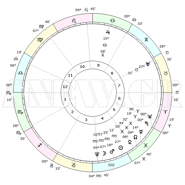 | | ΘΕΣΕΙΣ ΠΛΑΝΗΤΩΝ ΑΣΤΡΟΛΟΓΙΚΟΥ ΧΑΡΤΗ ΤΗΣ ΣΤΙΓΜΗΣ ΑΥΤΗΣ | | | | Πλανήτης | Ζώδιο | Μοίρες | Δεκαήμ. | Σε οίκο | Απόκλιση | | Ακμές των οίκων | | Ηλιος | Υδροχόος | 27°09' | Τρίτο | 5 | 12 S 27 | | 1ος | 14°56' | Ζυγός | | Σελήνη | Υδροχόος | 07°12' | Πρώτο | 4 | 21 S 09 | | 2ος | 12°29' | Σκορπιός | | Ερμής | Ιχθείς | 14°27' | Δεύτερο | 5 | 05 S 54 | | 3ος | 13°31' | Τοξότης | | Αφροδίτη | Ιχθείς | 06°46' | Πρώτο | 5 | 10 S 23 | | 4ος | 16°52' | Αιγόκερως | | Αρης | Υδροχόος | 18°23' | Δεύτερο | 4 | 16 S 21 | | 5ος | 19°49' | Υδροχόος | | Δίας | Καρκίνος | 15°58'R | Δεύτερο | 9 | 22 N 48 | | 6ος | 19°34' | Ιχθείς | | Κρόνος | Κριός | 00°19' | Πρώτο | 6 | 01 S 51 | | 7ος | 14°56' | Κριός | | Ουρανός | Ταύρος | 27°31' | Τρίτο | 8 | 19 N 25 | | 8ος | 12°29' | Ταύρος | | Ποσειδώνας | Κριός | 00°36' | Πρώτο | 6 | 00 S 58 | | 9ος | 13°31' | Δίδυμοι | | Πλούτωνας | Υδροχόος | 04°10' | Πρώτο | 4 | 22 S 56 | | 10ος | 16°52' | Καρκίνος | | Β. Δεσμός | Ιχθείς | 09°45' | Πρώτο | 5 | 07 S 55 | | 11ος | 19°49' | Λέων | | Ωροσκόπος | Ζυγός | 14°56' | Δεύτερο | | | 12ος | 19°34' | Παρθένος | | Μεσουράνημα | Καρκίνος | 16°52' | Δεύτερο | | | |