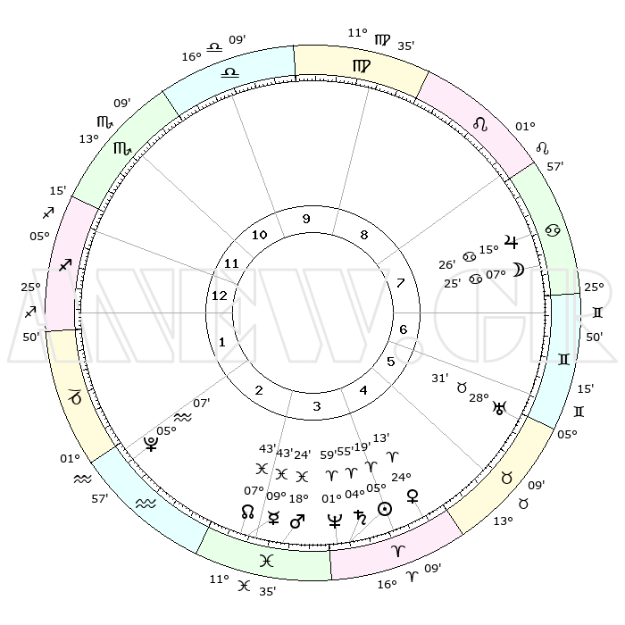 | | ΘΕΣΕΙΣ ΠΛΑΝΗΤΩΝ ΑΣΤΡΟΛΟΓΙΚΟΥ ΧΑΡΤΗ ΤΗΣ ΣΤΙΓΜΗΣ ΑΥΤΗΣ | | | | Πλανήτης | Ζώδιο | Μοίρες | Δεκαήμ. | Σε οίκο | Απόκλιση | | Ακμές των οίκων | | Ηλιος | Κριός | 05°15' | Πρώτο | 4 | 02 N 05 | | 1ος | 04°09' | Τοξότης | | Σελήνη | Καρκίνος | 06°26' | Πρώτο | 8 | 27 N 54 | | 2ος | 05°53' | Αιγόκερως | | Ερμής | Ιχθείς | 09°41' | Πρώτο | 3 | 08 S 06 | | 3ος | 12°17' | Υδροχόος | | Αφροδίτη | Κριός | 24°07' | Τρίτο | 5 | 08 N 43 | | 4ος | 18°23' | Ιχθείς | | Αρης | Ιχθείς | 18°21' | Δεύτερο | 3 | 05 S 35 | | 5ος | 18°52' | Κριός | | Δίας | Καρκίνος | 15°26' | Δεύτερο | 8 | 22 N 54 | | 6ος | 13°21' | Ταύρος | | Κρόνος | Κριός | 04°54' | Πρώτο | 4 | 00 S 00 | | 7ος | 04°09' | Δίδυμοι | | Ουρανός | Ταύρος | 28°31' | Τρίτο | 6 | 19 N 39 | | 8ος | 05°53' | Καρκίνος | | Ποσειδώνας | Κριός | 01°59' | Πρώτο | 4 | 00 S 25 | | 9ος | 12°17' | Λέων | | Πλούτωνας | Υδροχόος | 05°07' | Πρώτο | 2 | 22 S 48 | | 10ος | 18°23' | Παρθένος | | Β. Δεσμός | Ιχθείς | 07°44' | Πρώτο | 3 | 08 S 40 | | 11ος | 18°52' | Ζυγός | | Ωροσκόπος | Τοξότης | 04°09' | Πρώτο | | | 12ος | 13°21' | Σκορπιός | | Μεσουράνημα | Παρθένος | 18°23' | Δεύτερο | | | |