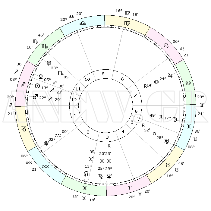 | | ΘΕΣΕΙΣ ΠΛΑΝΗΤΩΝ ΑΣΤΡΟΛΟΓΙΚΟΥ ΧΑΡΤΗ ΤΗΣ ΣΤΙΓΜΗΣ ΑΥΤΗΣ | | | | Πλανήτης | Ζώδιο | Μοίρες | Δεκαήμ. | Σε οίκο | Απόκλιση | | Ακμές των οίκων | | Ηλιος | Τοξότης | 13°21' | Δεύτερο | 12 | 22 S 24 | | 1ος | 21°19' | Τοξότης | | Σελήνη | Δίδυμοι | 17°26' | Δεύτερο | 6 | 27 N 48 | | 2ος | 26°22' | Αιγόκερως | | Ερμής | Σκορπιός | 23°04' | Τρίτο | 11 | 16 S 05 | | 3ος | 05°29' | Ιχθείς | | Αφροδίτη | Τοξότης | 05°34' | Πρώτο | 12 | 20 S 41 | | 4ος | 10°37' | Κριός | | Αρης | Τοξότης | 22°28' | Τρίτο | 1 | 23 S 55 | | 5ος | 08°22' | Ταύρος | | Δίας | Καρκίνος | 24°14'R | Τρίτο | 7 | 21 N 26 | | 6ος | 00°52' | Δίδυμοι | | Κρόνος | Ιχθείς | 25°20' | Τρίτο | 3 | 04 S 01 | | 7ος | 21°19' | Δίδυμοι | | Ουρανός | Ταύρος | 28°52'R | Τρίτο | 5 | 19 N 42 | | 8ος | 26°22' | Καρκίνος | | Ποσειδώνας | Ιχθείς | 29°23'R | Τρίτο | 3 | 01 S 29 | | 9ος | 05°29' | Παρθένος | | Πλούτωνας | Υδροχόος | 02°00' | Πρώτο | 2 | 23 S 23 | | 10ος | 10°37' | Ζυγός | | Β. Δεσμός | Ιχθείς | 13°35' | Δεύτερο | 3 | 06 S 27 | | 11ος | 08°22' | Σκορπιός | | Ωροσκόπος | Τοξότης | 21°19' | Τρίτο | | | 12ος | 00°52' | Τοξότης | | Μεσουράνημα | Ζυγός | 10°37' | Δεύτερο | | | |