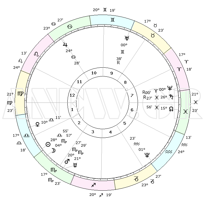 | ΘΕΣΕΙΣ ΠΛΑΝΗΤΩΝ ΑΣΤΡΟΛΟΓΙΚΟΥ ΧΑΡΤΗ ΤΗΣ ΣΤΙΓΜΗΣ ΑΥΤΗΣ | | Πλανήτης | Ζώδιο | Μοίρες | Δεκαήμ. | Σε οίκο | Απόκλιση | | Ακμές των οίκων | Ηλιος | Ζυγός | 28°34' | Τρίτο | 6 | 10 S 58 | | 1ος | 01°06' | Δίδυμοι | Σελήνη | Σκορπιός | 00°45' | Πρώτο | 6 | 15 S 01 | | 2ος | 25°42' | Δίδυμοι | Ερμής | Σκορπιός | 21°02' | Τρίτο | 6 | 20 S 18 | | 3ος | 17°05' | Καρκίνος | Αφροδίτη | Ζυγός | 09°45' | Πρώτο | 5 | 02 S 27 | | 4ος | 09°55' | Λέων | Αρης | Σκορπιός | 20°12' | Τρίτο | 6 | 18 S 04 | | 5ος | 08°34' | Παρθένος | Δίας | Καρκίνος | 24°27' | Τρίτο | 3 | 21 N 17 | | 6ος | 17°11' | Ζυγός | Κρόνος | Ιχθείς | 26°28'R | Τρίτο | 11 | 03 S 41 | | 7ος | 01°06' | Τοξότης | Ουρανός | Δίδυμοι | 00°39'R | Πρώτο | 12 | 20 N 04 | | 8ος | 25°42' | Τοξότης | Ποσειδώνας | Κριός | 00°01'R | Πρώτο | 11 | 01 S 15 | | 9ος | 17°04' | Αιγόκερως | Πλούτωνας | Υδροχόος | 01°23' | Πρώτο | 9 | 23 S 32 | | 10ος | 09°55' | Υδροχόος | Β. Δεσμός | Ιχθείς | 15°57' | Δεύτερο | 11 | 05 S 33 | | 11ος | 08°34' | Ιχθείς | Ωροσκόπος | Δίδυμοι | 01°06' | Πρώτο | | | 12ος | 17°11' | Κριός | Μεσουράνημα | Υδροχόος | 09°55' | Πρώτο | | | |