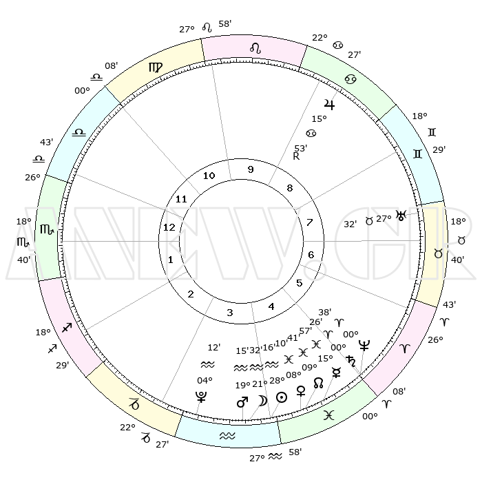 | | ΘΕΣΕΙΣ ΠΛΑΝΗΤΩΝ ΑΣΤΡΟΛΟΓΙΚΟΥ ΧΑΡΤΗ ΤΗΣ ΣΤΙΓΜΗΣ ΑΥΤΗΣ | | | | Πλανήτης | Ζώδιο | Μοίρες | Δεκαήμ. | Σε οίκο | Απόκλιση | | Ακμές των οίκων | | Ηλιος | Υδροχόος | 28°12' | Τρίτο | 4 | 12 S 06 | | 1ος | 28°32' | Ζυγός | | Σελήνη | Υδροχόος | 20°38' | Τρίτο | 4 | 16 S 11 | | 2ος | 26°51' | Σκορπιός | | Ερμής | Ιχθείς | 15°52' | Δεύτερο | 5 | 05 S 08 | | 3ος | 28°42' | Τοξότης | | Αφροδίτη | Ιχθείς | 08°05' | Πρώτο | 5 | 09 S 54 | | 4ος | 02°47' | Υδροχόος | | Αρης | Υδροχόος | 19°12' | Δεύτερο | 4 | 16 S 05 | | 5ος | 05°43' | Ιχθείς | | Δίας | Καρκίνος | 15°53'R | Δεύτερο | 9 | 22 N 49 | | 6ος | 04°31' | Κριός | | Κρόνος | Κριός | 00°26' | Πρώτο | 5 | 01 S 48 | | 7ος | 28°32' | Κριός | | Ουρανός | Ταύρος | 27°32' | Τρίτο | 8 | 19 N 26 | | 8ος | 26°51' | Ταύρος | | Ποσειδώνας | Κριός | 00°38' | Πρώτο | 5 | 00 S 57 | | 9ος | 28°42' | Δίδυμοι | | Πλούτωνας | Υδροχόος | 04°12' | Πρώτο | 4 | 22 S 56 | | 10ος | 02°47' | Λέων | | Β. Δεσμός | Ιχθείς | 09°41' | Πρώτο | 5 | 07 S 56 | | 11ος | 05°43' | Παρθένος | | Ωροσκόπος | Ζυγός | 28°32' | Τρίτο | | | 12ος | 04°31' | Ζυγός | | Μεσουράνημα | Λέων | 02°47' | Πρώτο | | | |