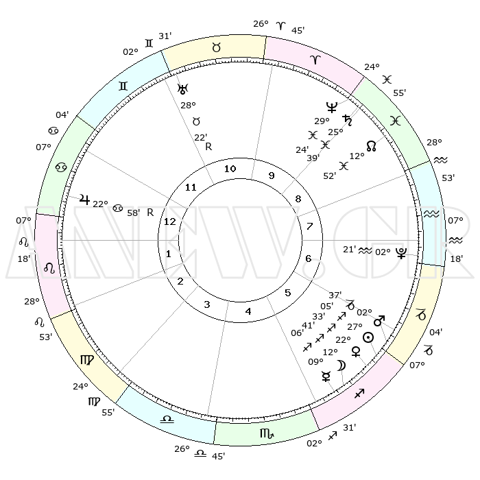 | | ΘΕΣΕΙΣ ΠΛΑΝΗΤΩΝ ΑΣΤΡΟΛΟΓΙΚΟΥ ΧΑΡΤΗ ΤΗΣ ΣΤΙΓΜΗΣ ΑΥΤΗΣ | | | | Πλανήτης | Ζώδιο | Μοίρες | Δεκαήμ. | Σε οίκο | Απόκλιση | | Ακμές των οίκων | | Ηλιος | Τοξότης | 26°38' | Τρίτο | 11 | 23 S 23 | | 1ος | 24°53' | Αιγόκερως | | Σελήνη | Τοξότης | 07°23' | Πρώτο | 10 | 26 S 27 | | 2ος | 08°03' | Ιχθείς | | Ερμής | Τοξότης | 08°28' | Πρώτο | 10 | 20 S 37 | | 3ος | 17°14' | Κριός | | Αφροδίτη | Τοξότης | 21°60' | Τρίτο | 11 | 23 S 10 | | 4ος | 16°36' | Ταύρος | | Αρης | Αιγόκερως | 02°17' | Πρώτο | 12 | 24 S 13 | | 5ος | 09°47' | Δίδυμοι | | Δίας | Καρκίνος | 23°01'R | Τρίτο | 6 | 21 N 40 | | 6ος | 01°03' | Καρκίνος | | Κρόνος | Ιχθείς | 25°38' | Τρίτο | 2 | 03 S 51 | | 7ος | 24°53' | Καρκίνος | | Ουρανός | Ταύρος | 28°23'R | Τρίτο | 4 | 19 N 36 | | 8ος | 08°03' | Παρθένος | | Ποσειδώνας | Ιχθείς | 29°23' | Τρίτο | 2 | 01 S 28 | | 9ος | 17°13' | Ζυγός | | Πλούτωνας | Υδροχόος | 02°20' | Πρώτο | 1 | 23 S 18 | | 10ος | 16°36' | Σκορπιός | | Β. Δεσμός | Ιχθείς | 12°54' | Δεύτερο | 2 | 06 S 43 | | 11ος | 09°47' | Τοξότης | | Ωροσκόπος | Αιγόκερως | 24°53' | Τρίτο | | | 12ος | 01°03' | Αιγόκερως | | Μεσουράνημα | Σκορπιός | 16°36' | Δεύτερο | | | |