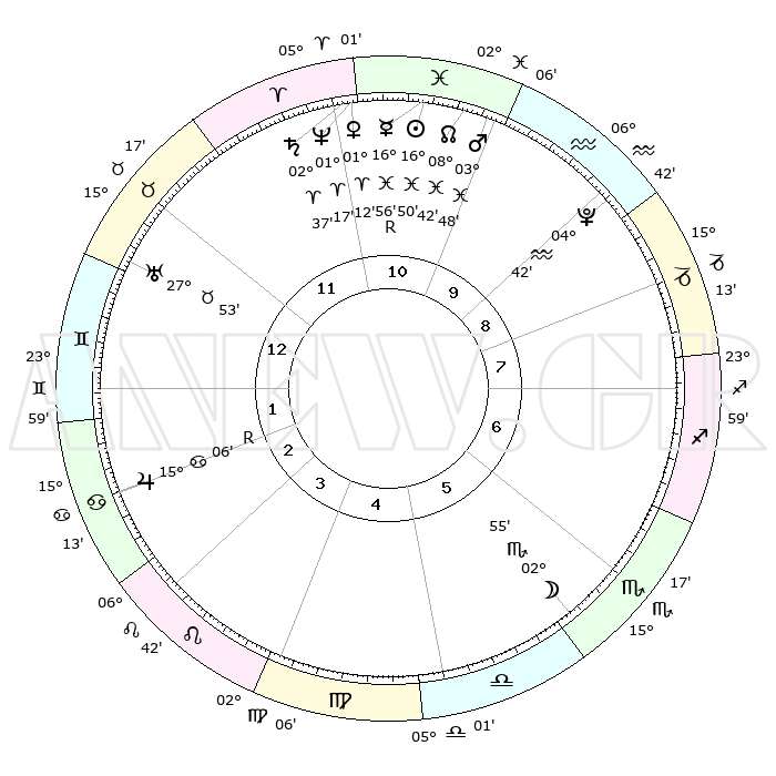 | | ΘΕΣΕΙΣ ΠΛΑΝΗΤΩΝ ΑΣΤΡΟΛΟΓΙΚΟΥ ΧΑΡΤΗ ΤΗΣ ΣΤΙΓΜΗΣ ΑΥΤΗΣ | | | | Πλανήτης | Ζώδιο | Μοίρες | Δεκαήμ. | Σε οίκο | Απόκλιση | | Ακμές των οίκων | | Ηλιος | Ιχθείς | 16°47' | Δεύτερο | 11 | 05 S 13 | | 1ος | 04°28' | Δίδυμοι | | Σελήνη | Σκορπιός | 02°16' | Πρώτο | 6 | 16 S 14 | | 2ος | 28°25' | Δίδυμοι | | Ερμής | Ιχθείς | 16°59'R | Δεύτερο | 11 | 01 S 47 | | 3ος | 19°42' | Καρκίνος | | Αφροδίτη | Κριός | 01°08' | Πρώτο | 11 | 00 S 41 | | 4ος | 12°49' | Λέων | | Αρης | Ιχθείς | 03°45' | Πρώτο | 10 | 11 S 09 | | 5ος | 12°04' | Παρθένος | | Δίας | Καρκίνος | 15°06'R | Δεύτερο | 2 | 22 N 56 | | 6ος | 21°10' | Ζυγός | | Κρόνος | Κριός | 02°36' | Πρώτο | 11 | 00 S 55 | | 7ος | 04°28' | Τοξότης | | Ουρανός | Ταύρος | 27°53' | Τρίτο | 12 | 19 N 31 | | 8ος | 28°25' | Τοξότης | | Ποσειδώνας | Κριός | 01°17' | Πρώτο | 11 | 00 S 41 | | 9ος | 19°42' | Αιγόκερως | | Πλούτωνας | Υδροχόος | 04°42' | Πρώτο | 9 | 22 S 51 | | 10ος | 12°49' | Υδροχόος | | Β. Δεσμός | Ιχθείς | 08°43' | Πρώτο | 10 | 08 S 18 | | 11ος | 12°04' | Ιχθείς | | Ωροσκόπος | Δίδυμοι | 04°28' | Πρώτο | | | 12ος | 21°10' | Κριός | | Μεσουράνημα | Υδροχόος | 12°49' | Δεύτερο | | | |