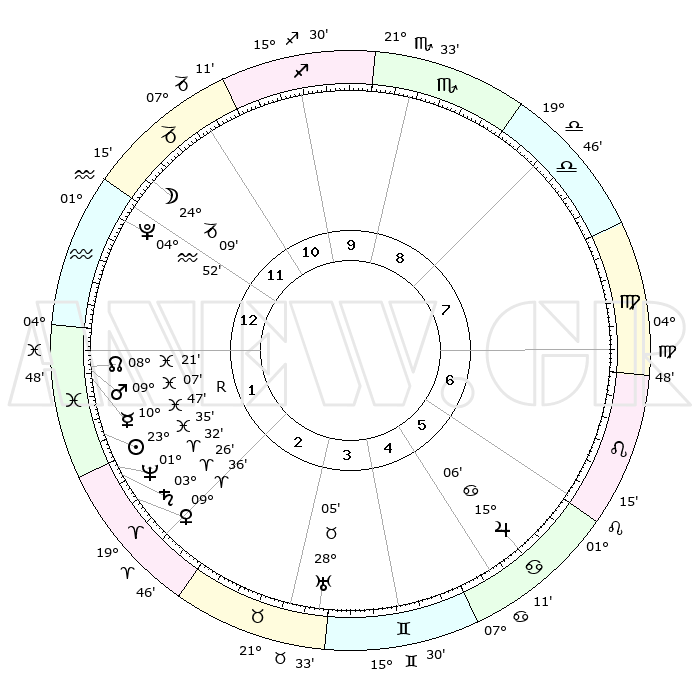 | | ΘΕΣΕΙΣ ΠΛΑΝΗΤΩΝ ΑΣΤΡΟΛΟΓΙΚΟΥ ΧΑΡΤΗ ΤΗΣ ΣΤΙΓΜΗΣ ΑΥΤΗΣ | | | | Πλανήτης | Ζώδιο | Μοίρες | Δεκαήμ. | Σε οίκο | Απόκλιση | | Ακμές των οίκων | | Ηλιος | Ιχθείς | 23°27' | Τρίτο | 2 | 02 S 36 | | 1ος | 05°59' | Αιγόκερως | | Σελήνη | Αιγόκερως | 22°30' | Τρίτο | 1 | 25 S 20 | | 2ος | 14°39' | Υδροχόος | | Ερμής | Ιχθείς | 10°52'R | Δεύτερο | 2 | 05 S 03 | | 3ος | 24°56' | Ιχθείς | | Αφροδίτη | Κριός | 09°26' | Πρώτο | 3 | 02 N 45 | | 4ος | 27°51' | Κριός | | Αρης | Ιχθείς | 09°01' | Πρώτο | 2 | 09 S 12 | | 5ος | 23°16' | Ταύρος | | Δίας | Καρκίνος | 15°06' | Δεύτερο | 7 | 22 N 56 | | 6ος | 14°44' | Δίδυμοι | | Κρόνος | Κριός | 03°25' | Πρώτο | 3 | 00 S 35 | | 7ος | 05°59' | Καρκίνος | | Ουρανός | Ταύρος | 28°05' | Τρίτο | 5 | 19 N 33 | | 8ος | 14°39' | Λέων | | Ποσειδώνας | Κριός | 01°32' | Πρώτο | 3 | 00 S 35 | | 9ος | 24°56' | Παρθένος | | Πλούτωνας | Υδροχόος | 04°52' | Πρώτο | 1 | 22 S 50 | | 10ος | 27°51' | Ζυγός | | Β. Δεσμός | Ιχθείς | 08°21' | Πρώτο | 2 | 08 S 26 | | 11ος | 23°16' | Σκορπιός | | Ωροσκόπος | Αιγόκερως | 05°59' | Πρώτο | | | 12ος | 14°44' | Τοξότης | | Μεσουράνημα | Ζυγός | 27°51' | Τρίτο | | | |