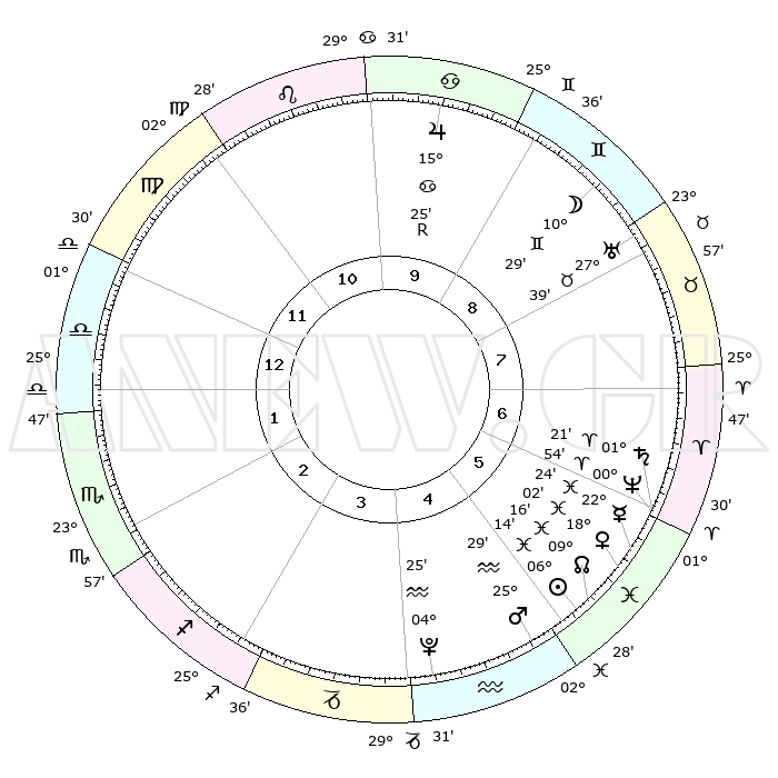 | | ΘΕΣΕΙΣ ΠΛΑΝΗΤΩΝ ΑΣΤΡΟΛΟΓΙΚΟΥ ΧΑΡΤΗ ΤΗΣ ΣΤΙΓΜΗΣ ΑΥΤΗΣ | | | | Πλανήτης | Ζώδιο | Μοίρες | Δεκαήμ. | Σε οίκο | Απόκλιση | | Ακμές των οίκων | | Ηλιος | Ιχθείς | 06°10' | Πρώτο | 5 | 09 S 15 | | 1ος | 06°50' | Ζυγός | | Σελήνη | Δίδυμοι | 09°34' | Πρώτο | 9 | 27 N 06 | | 2ος | 03°53' | Σκορπιός | | Ερμής | Ιχθείς | 22°23' | Τρίτο | 6 | 00 S 46 | | 3ος | 04°35' | Τοξότης | | Αφροδίτη | Ιχθείς | 17°57' | Δεύτερο | 6 | 06 S 04 | | 4ος | 07°41' | Αιγόκερως | | Αρης | Υδροχόος | 25°26' | Τρίτο | 5 | 14 S 04 | | 5ος | 10°37' | Υδροχόος | | Δίας | Καρκίνος | 15°25'R | Δεύτερο | 10 | 22 N 53 | | 6ος | 10°46' | Ιχθείς | | Κρόνος | Κριός | 01°20' | Πρώτο | 6 | 01 S 26 | | 7ος | 06°50' | Κριός | | Ουρανός | Ταύρος | 27°39' | Τρίτο | 8 | 19 N 27 | | 8ος | 03°53' | Ταύρος | | Ποσειδώνας | Κριός | 00°54' | Πρώτο | 6 | 00 S 51 | | 9ος | 04°35' | Δίδυμοι | | Πλούτωνας | Υδροχόος | 04°25' | Πρώτο | 4 | 22 S 54 | | 10ος | 07°41' | Καρκίνος | | Β. Δεσμός | Ιχθείς | 09°16' | Πρώτο | 5 | 08 S 06 | | 11ος | 10°37' | Λέων | | Ωροσκόπος | Ζυγός | 06°50' | Πρώτο | | | 12ος | 10°46' | Παρθένος | | Μεσουράνημα | Καρκίνος | 07°41' | Πρώτο | | | |