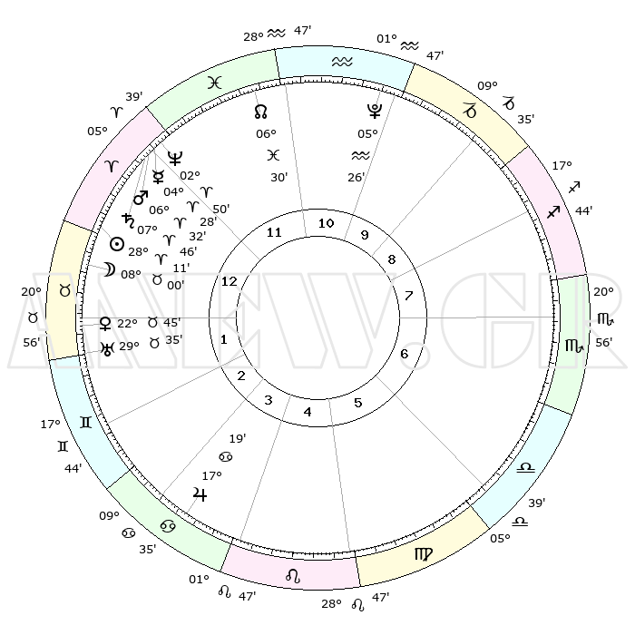 | | ΘΕΣΕΙΣ ΠΛΑΝΗΤΩΝ ΑΣΤΡΟΛΟΓΙΚΟΥ ΧΑΡΤΗ ΤΗΣ ΣΤΙΓΜΗΣ ΑΥΤΗΣ | | | | Πλανήτης | Ζώδιο | Μοίρες | Δεκαήμ. | Σε οίκο | Απόκλιση | | Ακμές των οίκων | | Ηλιος | Κριός | 28°08' | Τρίτο | 1 | 10 N 48 | | 1ος | 20°54' | Κριός | | Σελήνη | Ταύρος | 07°09' | Πρώτο | 1 | 18 N 03 | | 2ος | 25°40' | Ταύρος | | Ερμής | Κριός | 04°23' | Πρώτο | 12 | 00 S 41 | | 3ος | 20°13' | Δίδυμοι | | Αφροδίτη | Ταύρος | 22°40' | Τρίτο | 1 | 18 N 44 | | 4ος | 11°57' | Καρκίνος | | Αρης | Κριός | 06°29' | Πρώτο | 12 | 01 N 41 | | 5ος | 05°32' | Λέων | | Δίας | Καρκίνος | 17°18' | Δεύτερο | 4 | 22 N 42 | | 6ος | 06°30' | Παρθένος | | Κρόνος | Κριός | 07°46' | Πρώτο | 12 | 01 N 06 | | 7ος | 20°54' | Ζυγός | | Ουρανός | Ταύρος | 29°35' | Τρίτο | 2 | 19 N 54 | | 8ος | 25°40' | Σκορπιός | | Ποσειδώνας | Κριός | 02°50' | Πρώτο | 12 | 00 S 05 | | 9ος | 20°13' | Τοξότης | | Πλούτωνας | Υδροχόος | 05°26' | Πρώτο | 10 | 22 S 47 | | 10ος | 11°57' | Αιγόκερως | | Β. Δεσμός | Ιχθείς | 06°30' | Πρώτο | 11 | 09 S 08 | | 11ος | 05°32' | Υδροχόος | | Ωροσκόπος | Κριός | 20°54' | Τρίτο | | | 12ος | 06°30' | Ιχθείς | | Μεσουράνημα | Αιγόκερως | 11°57' | Δεύτερο | | | |