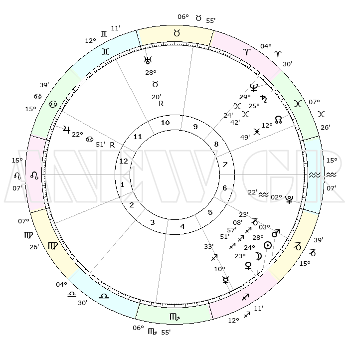 | | ΘΕΣΕΙΣ ΠΛΑΝΗΤΩΝ ΑΣΤΡΟΛΟΓΙΚΟΥ ΧΑΡΤΗ ΤΗΣ ΣΤΙΓΜΗΣ ΑΥΤΗΣ | | | | Πλανήτης | Ζώδιο | Μοίρες | Δεκαήμ. | Σε οίκο | Απόκλιση | | Ακμές των οίκων | | Ηλιος | Τοξότης | 28°03' | Τρίτο | 6 | 23 S 25 | | 1ος | 24°54' | Καρκίνος | | Σελήνη | Τοξότης | 24°07' | Τρίτο | 6 | 28 S 11 | | 2ος | 15°38' | Λέων | | Ερμής | Τοξότης | 10°27' | Δεύτερο | 5 | 21 S 05 | | 3ος | 10°00' | Παρθένος | | Αφροδίτη | Τοξότης | 23°45' | Τρίτο | 6 | 23 S 19 | | 4ος | 10°21' | Ζυγός | | Αρης | Αιγόκερως | 03°20' | Πρώτο | 6 | 24 S 12 | | 5ος | 16°27' | Σκορπιός | | Δίας | Καρκίνος | 22°52'R | Τρίτο | 12 | 21 N 42 | | 6ος | 23°00' | Τοξότης | | Κρόνος | Ιχθείς | 25°42' | Τρίτο | 9 | 03 S 49 | | 7ος | 24°54' | Αιγόκερως | | Ουρανός | Ταύρος | 28°20'R | Τρίτο | 11 | 19 N 35 | | 8ος | 15°38' | Υδροχόος | | Ποσειδώνας | Ιχθείς | 29°24' | Τρίτο | 9 | 01 S 28 | | 9ος | 10°00' | Ιχθείς | | Πλούτωνας | Υδροχόος | 02°22' | Πρώτο | 7 | 23 S 18 | | 10ος | 10°21' | Κριός | | Β. Δεσμός | Ιχθείς | 12°49' | Δεύτερο | 9 | 06 S 45 | | 11ος | 16°27' | Ταύρος | | Ωροσκόπος | Καρκίνος | 24°54' | Τρίτο | | | 12ος | 23°00' | Δίδυμοι | | Μεσουράνημα | Κριός | 10°21' | Δεύτερο | | | |
