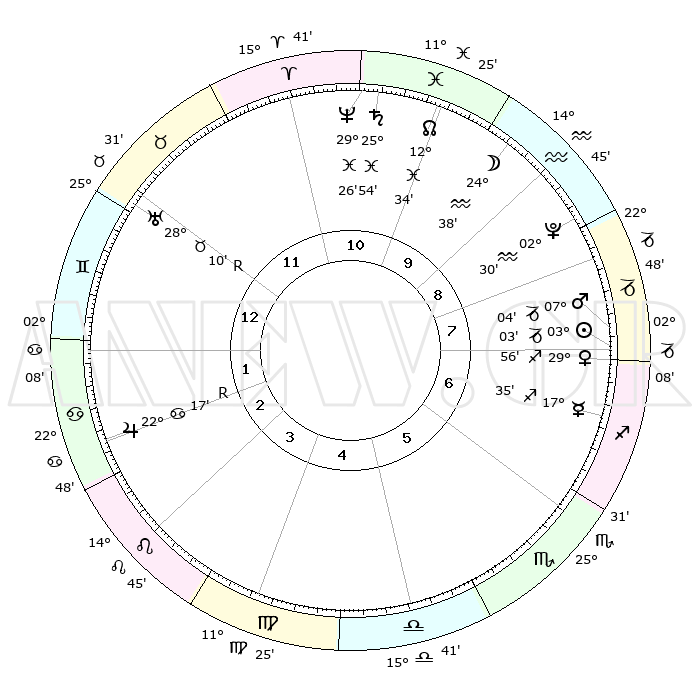 | | ΘΕΣΕΙΣ ΠΛΑΝΗΤΩΝ ΑΣΤΡΟΛΟΓΙΚΟΥ ΧΑΡΤΗ ΤΗΣ ΣΤΙΓΜΗΣ ΑΥΤΗΣ | | | | Πλανήτης | Ζώδιο | Μοίρες | Δεκαήμ. | Σε οίκο | Απόκλιση | | Ακμές των οίκων | | Ηλιος | Αιγόκερως | 02°59' | Πρώτο | 8 | 23 S 24 | | 1ος | 04°28' | Δίδυμοι | | Σελήνη | Υδροχόος | 23°40' | Τρίτο | 10 | 15 S 04 | | 2ος | 28°24' | Δίδυμοι | | Ερμής | Τοξότης | 17°29' | Δεύτερο | 7 | 22 S 32 | | 3ος | 19°42' | Καρκίνος | | Αφροδίτη | Τοξότης | 29°51' | Τρίτο | 8 | 23 S 39 | | 4ος | 12°49' | Λέων | | Αρης | Αιγόκερως | 07°01' | Πρώτο | 8 | 24 S 05 | | 5ος | 12°04' | Παρθένος | | Δίας | Καρκίνος | 22°18'R | Τρίτο | 3 | 21 N 48 | | 6ος | 21°10' | Ζυγός | | Κρόνος | Ιχθείς | 25°54' | Τρίτο | 11 | 03 S 44 | | 7ος | 04°28' | Τοξότης | | Ουρανός | Ταύρος | 28°10'R | Τρίτο | 12 | 19 N 33 | | 8ος | 28°24' | Τοξότης | | Ποσειδώνας | Ιχθείς | 29°26' | Τρίτο | 11 | 01 S 27 | | 9ος | 19°42' | Αιγόκερως | | Πλούτωνας | Υδροχόος | 02°30' | Πρώτο | 9 | 23 S 16 | | 10ος | 12°49' | Υδροχόος | | Β. Δεσμός | Ιχθείς | 12°34' | Δεύτερο | 11 | 06 S 51 | | 11ος | 12°04' | Ιχθείς | | Ωροσκόπος | Δίδυμοι | 04°28' | Πρώτο | | | 12ος | 21°10' | Κριός | | Μεσουράνημα | Υδροχόος | 12°49' | Δεύτερο | | | |