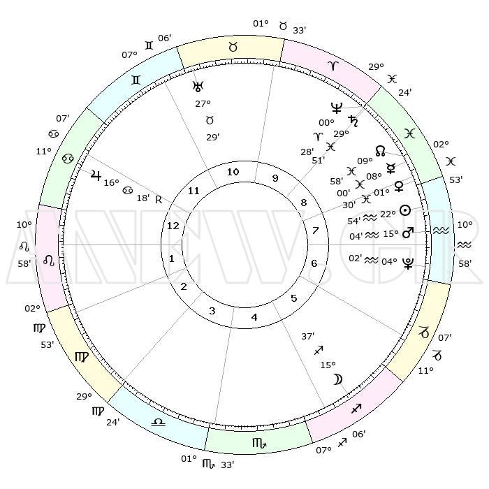 | | ΘΕΣΕΙΣ ΠΛΑΝΗΤΩΝ ΑΣΤΡΟΛΟΓΙΚΟΥ ΧΑΡΤΗ ΤΗΣ ΣΤΙΓΜΗΣ ΑΥΤΗΣ | | | | Πλανήτης | Ζώδιο | Μοίρες | Δεκαήμ. | Σε οίκο | Απόκλιση | | Ακμές των οίκων | | Ηλιος | Υδροχόος | 22°50' | Τρίτο | 8 | 13 S 54 | | 1ος | 21°15' | Καρκίνος | | Σελήνη | Τοξότης | 14°49' | Δεύτερο | 5 | 27 S 46 | | 2ος | 11°50' | Λέων | | Ερμής | Ιχθείς | 07°54' | Πρώτο | 9 | 09 S 12 | | 3ος | 05°44' | Παρθένος | | Αφροδίτη | Ιχθείς | 01°25' | Πρώτο | 8 | 12 S 20 | | 4ος | 05°32' | Ζυγός | | Αρης | Υδροχόος | 15°01' | Δεύτερο | 8 | 17 S 21 | | 5ος | 11°34' | Σκορπιός | | Δίας | Καρκίνος | 16°18'R | Δεύτερο | 12 | 22 N 45 | | 6ος | 18°45' | Τοξότης | | Κρόνος | Ιχθείς | 29°51' | Τρίτο | 9 | 02 S 02 | | 7ος | 21°15' | Αιγόκερως | | Ουρανός | Ταύρος | 27°29' | Τρίτο | 11 | 19 N 25 | | 8ος | 11°50' | Υδροχόος | | Ποσειδώνας | Κριός | 00°27' | Πρώτο | 9 | 01 S 01 | | 9ος | 05°44' | Ιχθείς | | Πλούτωνας | Υδροχόος | 04°02' | Πρώτο | 7 | 22 S 58 | | 10ος | 05°32' | Κριός | | Β. Δεσμός | Ιχθείς | 09°58' | Πρώτο | 9 | 07 S 50 | | 11ος | 11°34' | Ταύρος | | Ωροσκόπος | Καρκίνος | 21°15' | Τρίτο | | | 12ος | 18°45' | Δίδυμοι | | Μεσουράνημα | Κριός | 05°32' | Πρώτο | | | |