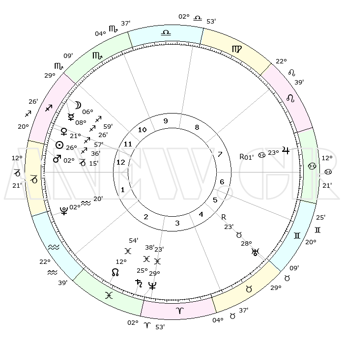 | | ΘΕΣΕΙΣ ΠΛΑΝΗΤΩΝ ΑΣΤΡΟΛΟΓΙΚΟΥ ΧΑΡΤΗ ΤΗΣ ΣΤΙΓΜΗΣ ΑΥΤΗΣ | | | | Πλανήτης | Ζώδιο | Μοίρες | Δεκαήμ. | Σε οίκο | Απόκλιση | | Ακμές των οίκων | | Ηλιος | Τοξότης | 26°15' | Τρίτο | 3 | 23 S 23 | | 1ος | 28°23' | Παρθένος | | Σελήνη | Τοξότης | 02°54' | Πρώτο | 3 | 25 S 34 | | 2ος | 24°51' | Ζυγός | | Ερμής | Τοξότης | 07°57' | Πρώτο | 3 | 20 S 29 | | 3ος | 25°13' | Σκορπιός | | Αφροδίτη | Τοξότης | 21°31' | Τρίτο | 3 | 23 S 07 | | 4ος | 28°11' | Τοξότης | | Αρης | Αιγόκερως | 01°59' | Πρώτο | 4 | 24 S 13 | | 5ος | 01°10' | Υδροχόος | | Δίας | Καρκίνος | 23°03'R | Τρίτο | 10 | 21 N 40 | | 6ος | 01°40' | Ιχθείς | | Κρόνος | Ιχθείς | 25°38' | Τρίτο | 6 | 03 S 51 | | 7ος | 28°23' | Ιχθείς | | Ουρανός | Ταύρος | 28°23'R | Τρίτο | 9 | 19 N 36 | | 8ος | 24°51' | Κριός | | Ποσειδώνας | Ιχθείς | 29°23' | Τρίτο | 7 | 01 S 28 | | 9ος | 25°13' | Ταύρος | | Πλούτωνας | Υδροχόος | 02°19' | Πρώτο | 5 | 23 S 18 | | 10ος | 28°10' | Δίδυμοι | | Β. Δεσμός | Ιχθείς | 12°55' | Δεύτερο | 6 | 06 S 43 | | 11ος | 01°10' | Λέων | | Ωροσκόπος | Παρθένος | 28°23' | Τρίτο | | | 12ος | 01°40' | Παρθένος | | Μεσουράνημα | Δίδυμοι | 28°10' | Τρίτο | | | |