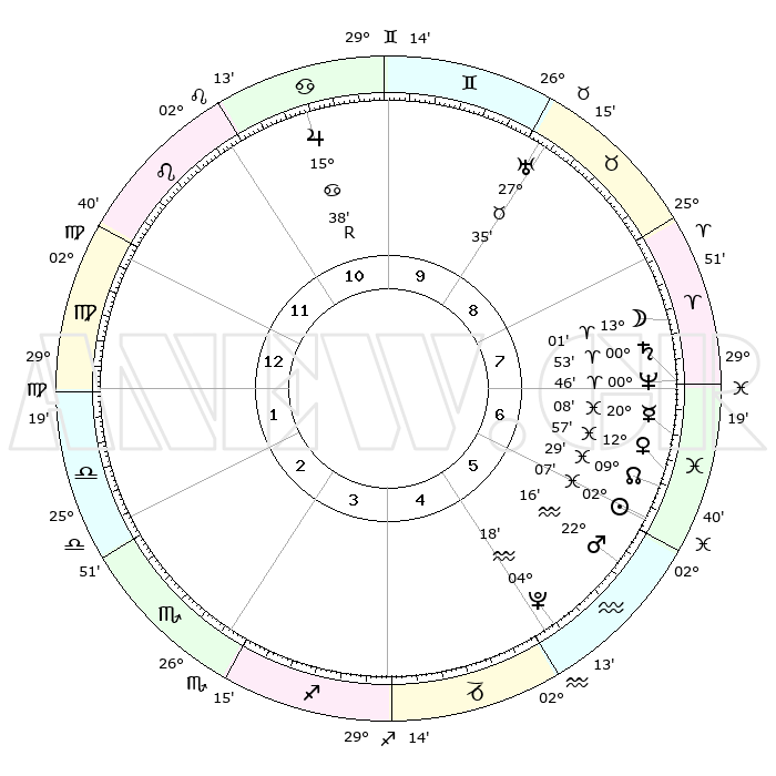 | | ΘΕΣΕΙΣ ΠΛΑΝΗΤΩΝ ΑΣΤΡΟΛΟΓΙΚΟΥ ΧΑΡΤΗ ΤΗΣ ΣΤΙΓΜΗΣ ΑΥΤΗΣ | | | | Πλανήτης | Ζώδιο | Μοίρες | Δεκαήμ. | Σε οίκο | Απόκλιση | | Ακμές των οίκων | | Ηλιος | Ιχθείς | 02°03' | Πρώτο | 6 | 10 S 44 | | 1ος | 09°42' | Παρθένος | | Σελήνη | Κριός | 12°06' | Δεύτερο | 8 | 07 N 27 | | 2ος | 04°32' | Ζυγός | | Ερμής | Ιχθείς | 20°04' | Τρίτο | 7 | 02 S 37 | | 3ος | 03°58' | Σκορπιός | | Αφροδίτη | Ιχθείς | 12°52' | Δεύτερο | 7 | 08 S 04 | | 4ος | 06°55' | Τοξότης | | Αρης | Υδροχόος | 22°13' | Τρίτο | 6 | 15 S 08 | | 5ος | 10°32' | Αιγόκερως | | Δίας | Καρκίνος | 15°38'R | Δεύτερο | 11 | 22 N 51 | | 6ος | 11°50' | Υδροχόος | | Κρόνος | Κριός | 00°52' | Πρώτο | 7 | 01 S 37 | | 7ος | 09°42' | Ιχθείς | | Ουρανός | Ταύρος | 27°35' | Τρίτο | 9 | 19 N 26 | | 8ος | 04°32' | Κριός | | Ποσειδώνας | Κριός | 00°45' | Πρώτο | 7 | 00 S 54 | | 9ος | 03°58' | Ταύρος | | Πλούτωνας | Υδροχόος | 04°18' | Πρώτο | 5 | 22 S 55 | | 10ος | 06°55' | Δίδυμοι | | Β. Δεσμός | Ιχθείς | 09°29' | Πρώτο | 6 | 08 S 01 | | 11ος | 10°32' | Καρκίνος | | Ωροσκόπος | Παρθένος | 09°42' | Πρώτο | | | 12ος | 11°50' | Λέων | | Μεσουράνημα | Δίδυμοι | 06°55' | Πρώτο | | | |