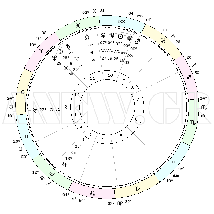 | | ΘΕΣΕΙΣ ΠΛΑΝΗΤΩΝ ΑΣΤΡΟΛΟΓΙΚΟΥ ΧΑΡΤΗ ΤΗΣ ΣΤΙΓΜΗΣ ΑΥΤΗΣ | | | | Πλανήτης | Ζώδιο | Μοίρες | Δεκαήμ. | Σε οίκο | Απόκλιση | | Ακμές των οίκων | | Ηλιος | Υδροχόος | 03°13' | Πρώτο | 1 | 19 S 26 | | 1ος | 29°39' | Αιγόκερως | | Σελήνη | Ιχθείς | 25°34' | Τρίτο | 2 | 00 S 26 | | 2ος | 13°41' | Ιχθείς | | Ερμής | Υδροχόος | 04°17' | Πρώτο | 1 | 21 S 12 | | 3ος | 22°11' | Κριός | | Αφροδίτη | Υδροχόος | 07°10' | Πρώτο | 1 | 19 S 38 | | 4ος | 20°43' | Ταύρος | | Αρης | Αιγόκερως | 29°53' | Τρίτο | 1 | 21 S 09 | | 5ος | 13°30' | Δίδυμοι | | Δίας | Καρκίνος | 18°24'R | Δεύτερο | 6 | 22 N 27 | | 6ος | 04°55' | Καρκίνος | | Κρόνος | Ιχθείς | 27°56' | Τρίτο | 2 | 02 S 50 | | 7ος | 29°39' | Καρκίνος | | Ουρανός | Ταύρος | 27°31'R | Τρίτο | 4 | 19 N 25 | | 8ος | 13°41' | Παρθένος | | Ποσειδώνας | Ιχθείς | 29°55' | Τρίτο | 2 | 01 S 15 | | 9ος | 22°11' | Ζυγός | | Πλούτωνας | Υδροχόος | 03°25' | Πρώτο | 1 | 23 S 05 | | 10ος | 20°43' | Σκορπιός | | Β. Δεσμός | Ιχθείς | 10°60' | Δεύτερο | 1 | 07 S 27 | | 11ος | 13°30' | Τοξότης | | Ωροσκόπος | Αιγόκερως | 29°39' | Τρίτο | | | 12ος | 04°55' | Αιγόκερως | | Μεσουράνημα | Σκορπιός | 20°43' | Τρίτο | | | |