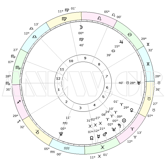 | | ΘΕΣΕΙΣ ΠΛΑΝΗΤΩΝ ΑΣΤΡΟΛΟΓΙΚΟΥ ΧΑΡΤΗ ΤΗΣ ΣΤΙΓΜΗΣ ΑΥΤΗΣ | | | | Πλανήτης | Ζώδιο | Μοίρες | Δεκαήμ. | Σε οίκο | Απόκλιση | | Ακμές των οίκων | | Ηλιος | Κριός | 09°06' | Πρώτο | 5 | 03 N 36 | | 1ος | 06°27' | Σκορπιός | | Σελήνη | Λέων | 29°39' | Τρίτο | 10 | 12 N 22 | | 2ος | 05°16' | Τοξότης | | Ερμής | Ιχθείς | 11°58' | Δεύτερο | 4 | 07 S 56 | | 3ος | 07°47' | Αιγόκερως | | Αφροδίτη | Κριός | 28°56' | Τρίτο | 6 | 10 N 36 | | 4ος | 12°26' | Υδροχόος | | Αρης | Ιχθείς | 21°24' | Τρίτο | 5 | 04 S 23 | | 5ος | 15°14' | Ιχθείς | | Δίας | Καρκίνος | 15°39' | Δεύτερο | 9 | 22 N 53 | | 6ος | 13°16' | Κριός | | Κρόνος | Κριός | 05°23' | Πρώτο | 5 | 00 N 11 | | 7ος | 06°27' | Ταύρος | | Ουρανός | Ταύρος | 28°40' | Τρίτο | 7 | 19 N 41 | | 8ος | 05°16' | Δίδυμοι | | Ποσειδώνας | Κριός | 02°08' | Πρώτο | 5 | 00 S 21 | | 9ος | 07°47' | Καρκίνος | | Πλούτωνας | Υδροχόος | 05°11' | Πρώτο | 3 | 22 S 48 | | 10ος | 12°26' | Λέων | | Β. Δεσμός | Ιχθείς | 07°31' | Πρώτο | 4 | 08 S 45 | | 11ος | 15°14' | Παρθένος | | Ωροσκόπος | Σκορπιός | 06°27' | Πρώτο | | | 12ος | 13°16' | Ζυγός | | Μεσουράνημα | Λέων | 12°26' | Δεύτερο | | | |