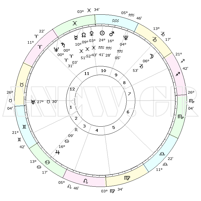 | | ΘΕΣΕΙΣ ΠΛΑΝΗΤΩΝ ΑΣΤΡΟΛΟΓΙΚΟΥ ΧΑΡΤΗ ΤΗΣ ΣΤΙΓΜΗΣ ΑΥΤΗΣ | | | | Πλανήτης | Ζώδιο | Μοίρες | Δεκαήμ. | Σε οίκο | Απόκλιση | | Ακμές των οίκων | | Ηλιος | Υδροχόος | 24°37' | Τρίτο | 11 | 13 S 19 | | 1ος | 25°19' | Κριός | | Σελήνη | Αιγόκερως | 06°08' | Πρώτο | 9 | 27 S 58 | | 2ος | 28°50' | Ταύρος | | Ερμής | Ιχθείς | 10°45' | Δεύτερο | 12 | 07 S 49 | | 3ος | 22°54' | Δίδυμοι | | Αφροδίτη | Ιχθείς | 03°39' | Πρώτο | 11 | 11 S 32 | | 4ος | 14°35' | Καρκίνος | | Αρης | Υδροχόος | 16°25' | Δεύτερο | 11 | 16 S 56 | | 5ος | 08°33' | Λέων | | Δίας | Καρκίνος | 16°09'R | Δεύτερο | 4 | 22 N 47 | | 6ος | 10°21' | Παρθένος | | Κρόνος | Κριός | 00°02' | Πρώτο | 12 | 01 S 57 | | 7ος | 25°19' | Ζυγός | | Ουρανός | Ταύρος | 27°30' | Τρίτο | 1 | 19 N 25 | | 8ος | 28°50' | Σκορπιός | | Ποσειδώνας | Κριός | 00°31' | Πρώτο | 12 | 01 S 00 | | 9ος | 22°54' | Τοξότης | | Πλούτωνας | Υδροχόος | 04°05' | Πρώτο | 10 | 22 S 57 | | 10ος | 14°35' | Αιγόκερως | | Β. Δεσμός | Ιχθείς | 09°53' | Πρώτο | 11 | 07 S 52 | | 11ος | 08°33' | Υδροχόος | | Ωροσκόπος | Κριός | 25°19' | Τρίτο | | | 12ος | 10°21' | Ιχθείς | | Μεσουράνημα | Αιγόκερως | 14°35' | Δεύτερο | | | |